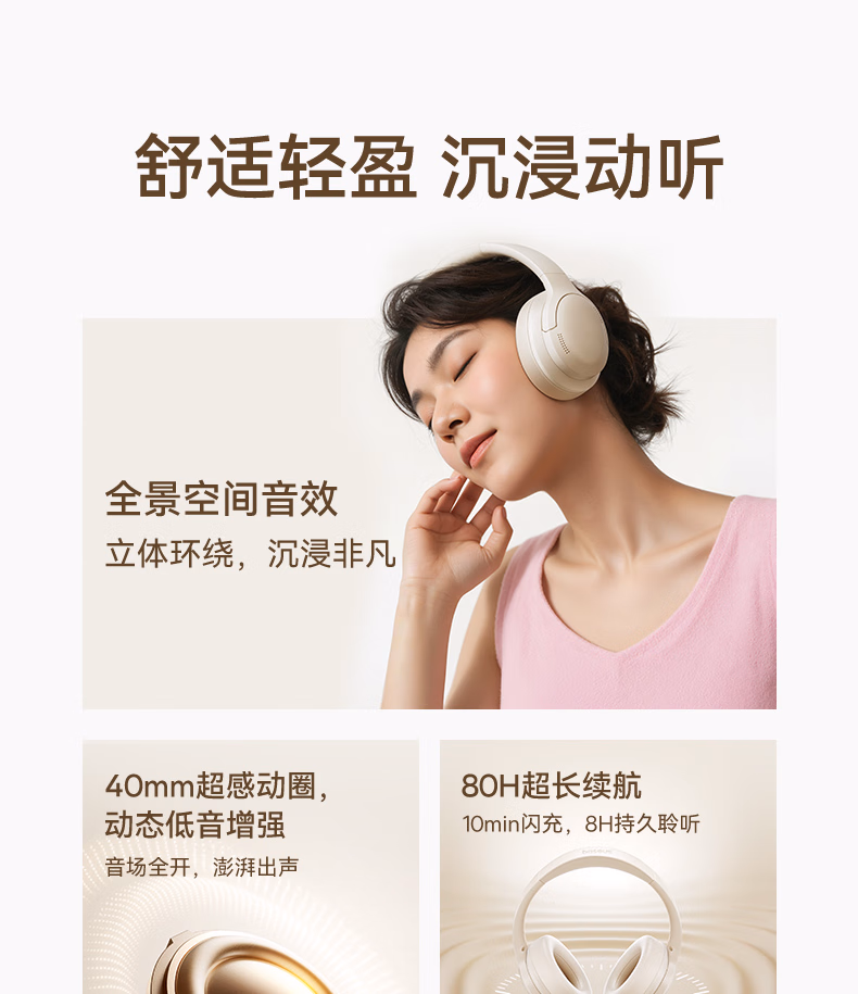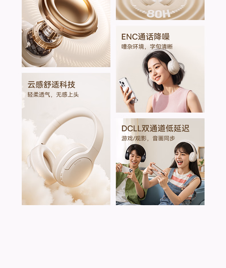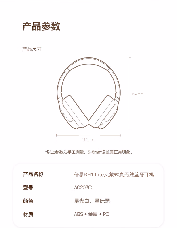 包装清单  :   倍思BH1 Lite耳机头戴式 真无线蓝牙V6.0物理降噪游戏电竞低延迟80H长续航