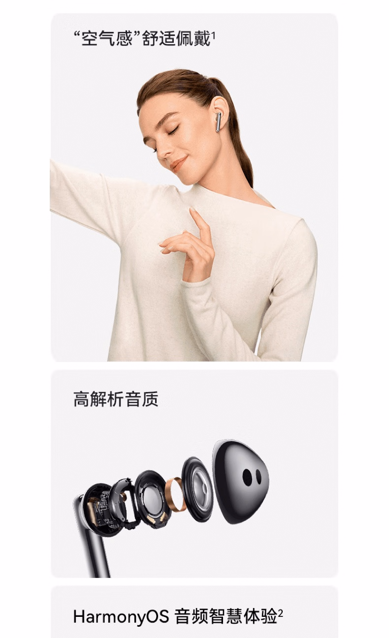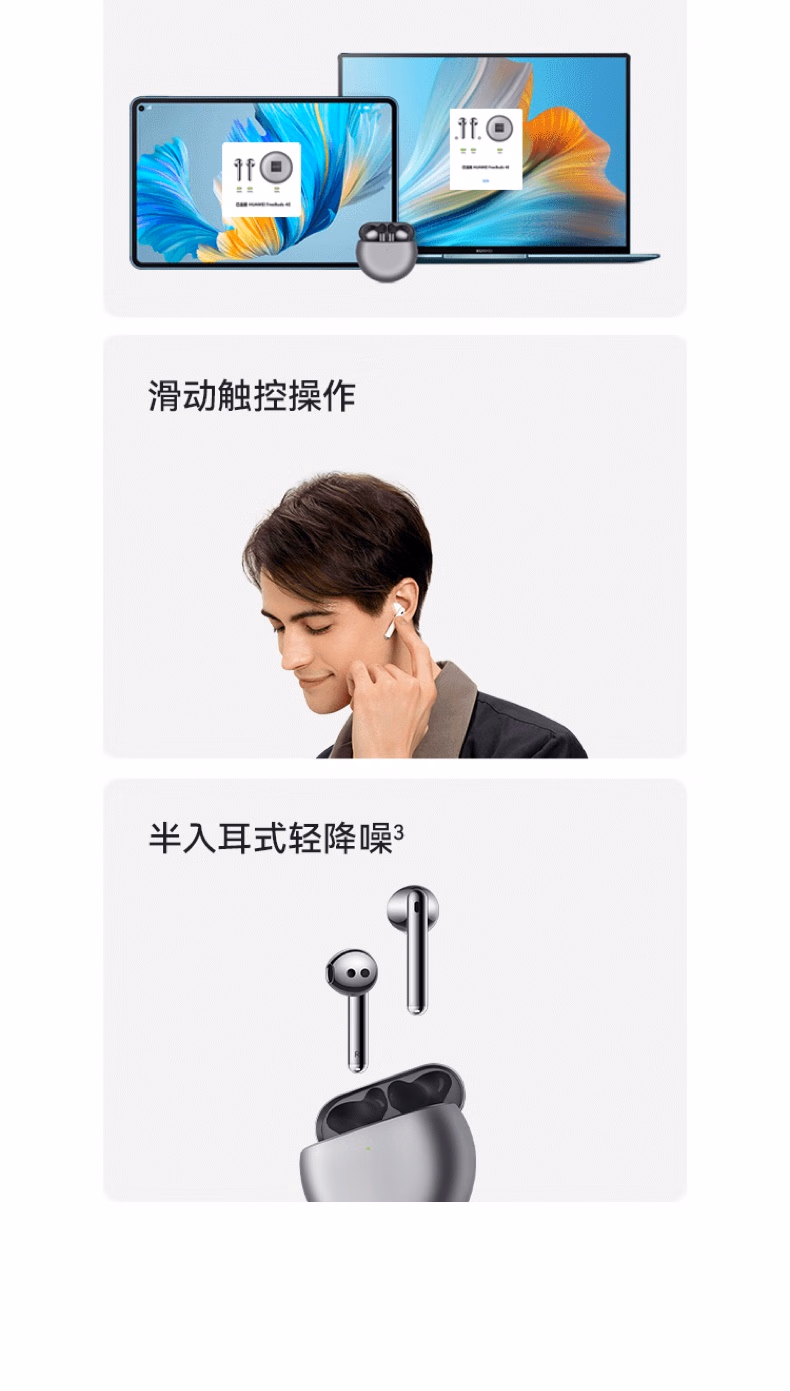 包装清单  :   华为FreeBuds 4E 真无线蓝牙耳机 半入耳舒适佩戴/游戏运动音乐耳机/高解析音质 冰霜银