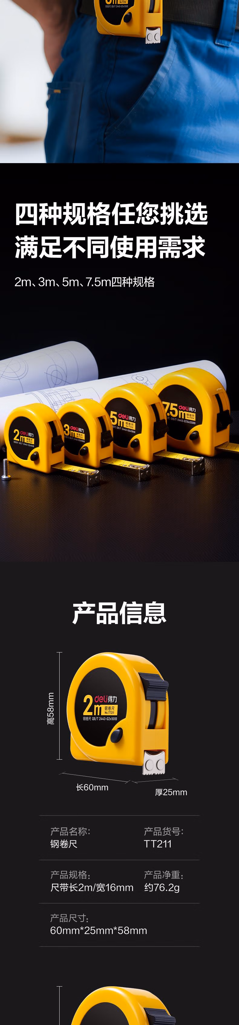 包装清单  :   得力3m锁定功能钢卷尺 木工尺装修测量尺子 办公用品TT212