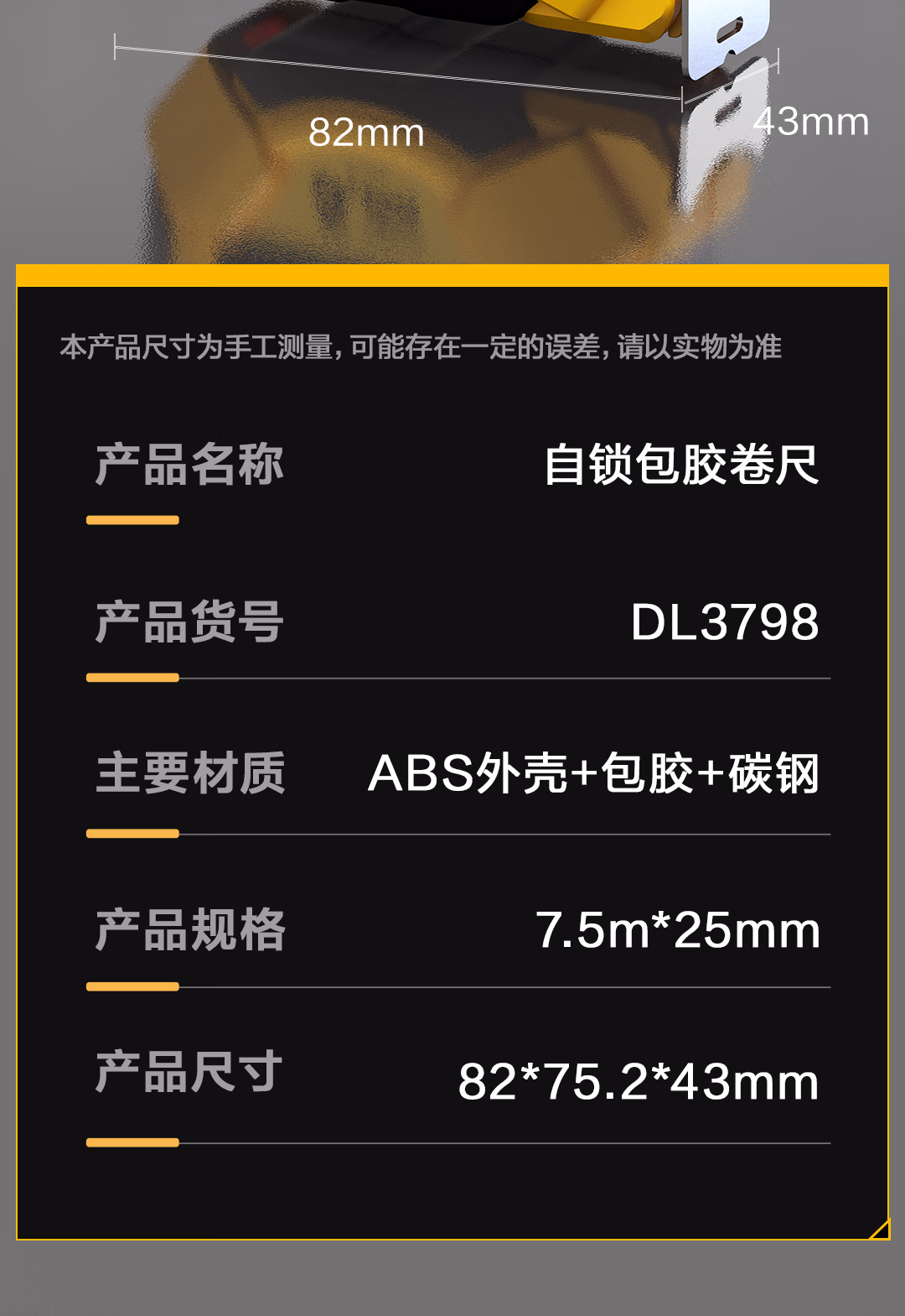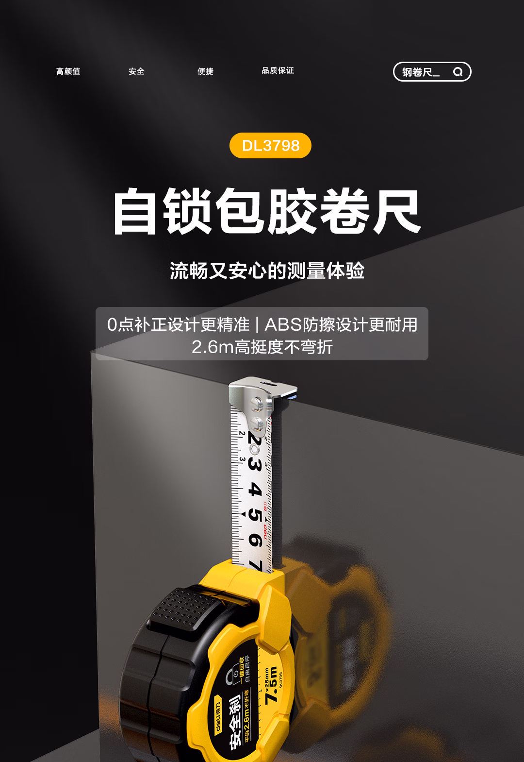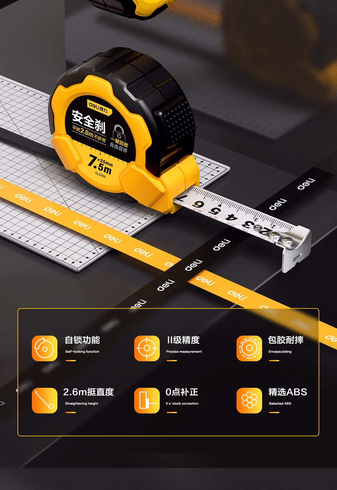 包装清单  :   得力(deli)包胶自锁钢卷尺盒尺伸缩尺米尺25mm宽工地卷尺防割手木工尺7.5米