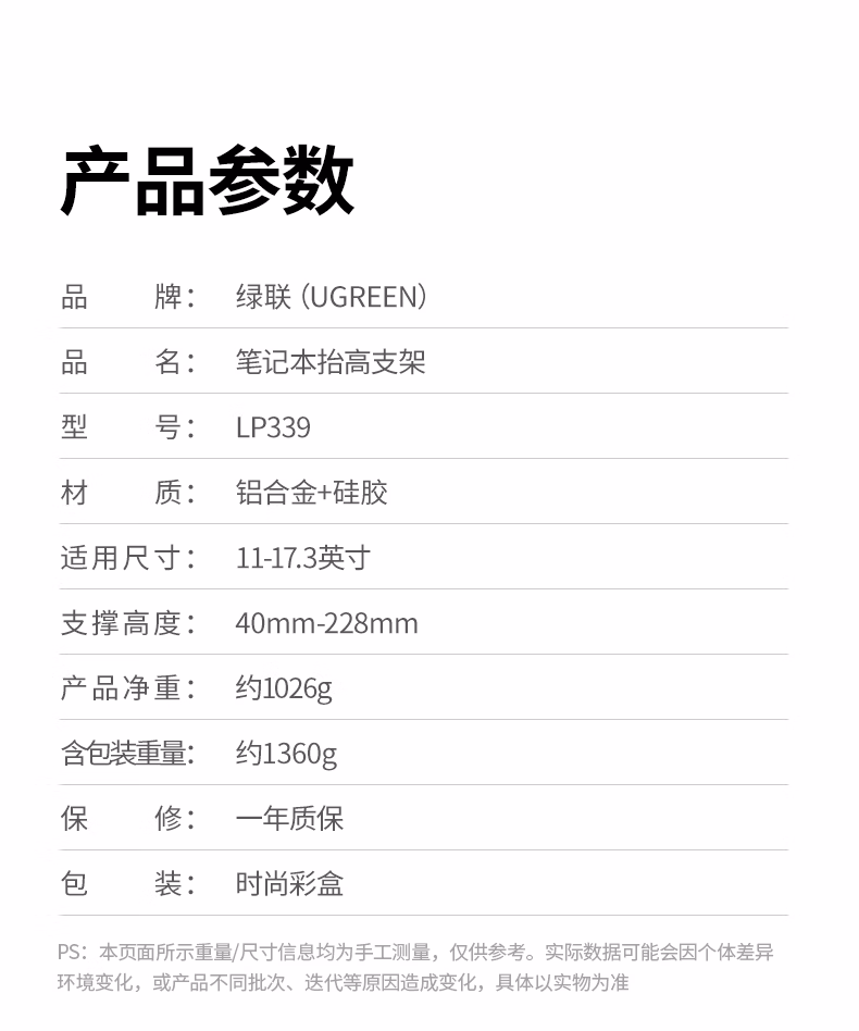 包装清单  :   绿联 笔记本支架 电脑桌支架散热架 立式升降悬空增高托架铝合金适配于苹果联想拯救者小新平板架