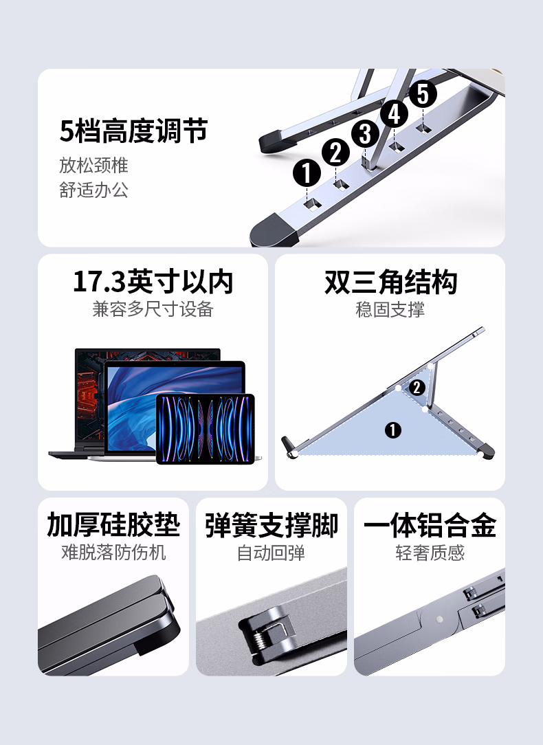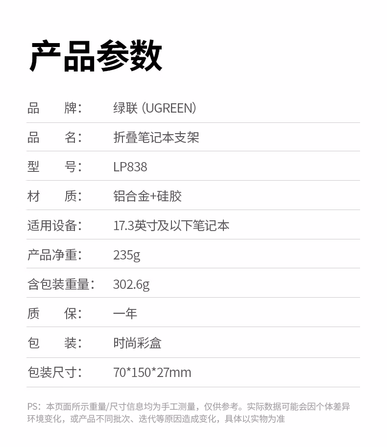 包装清单  :   绿联笔记本支架电脑支架散热悬空立式支架便携折叠增高架铝合金
