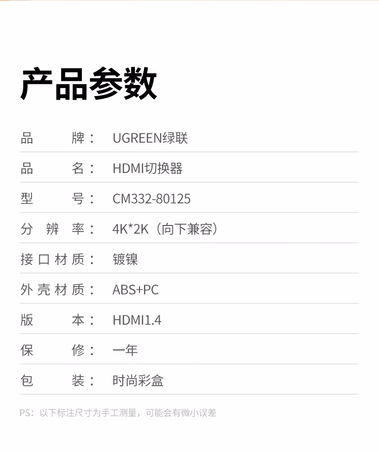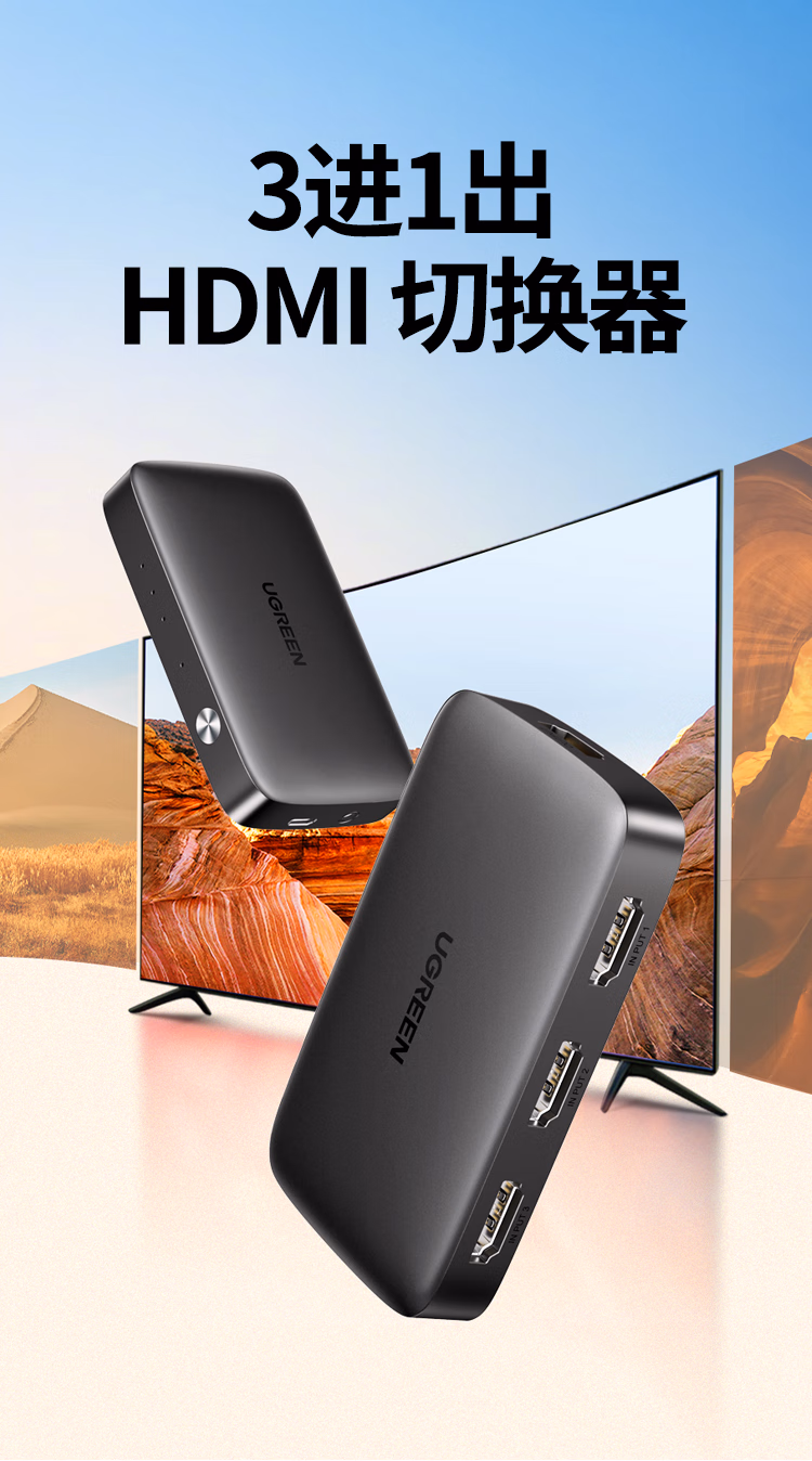 包装清单  :   绿联 HDMI4K高清切换器3进1出三进一出视频切屏笔记本电脑台式机接电视显示器投影仪兼容二进一出80125