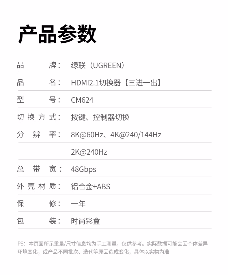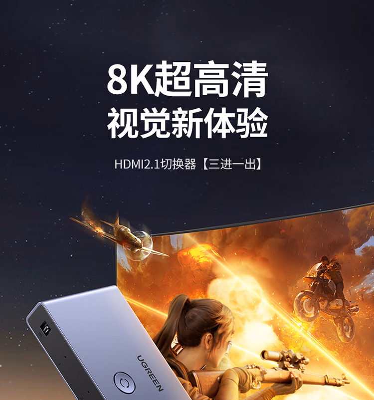 包装清单  :   绿联HDMI切换器三进一出2.1版 8K60Hz高清视频共享分屏适用电脑笔记本游戏机接显示器电视投影仪15263