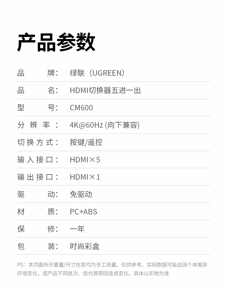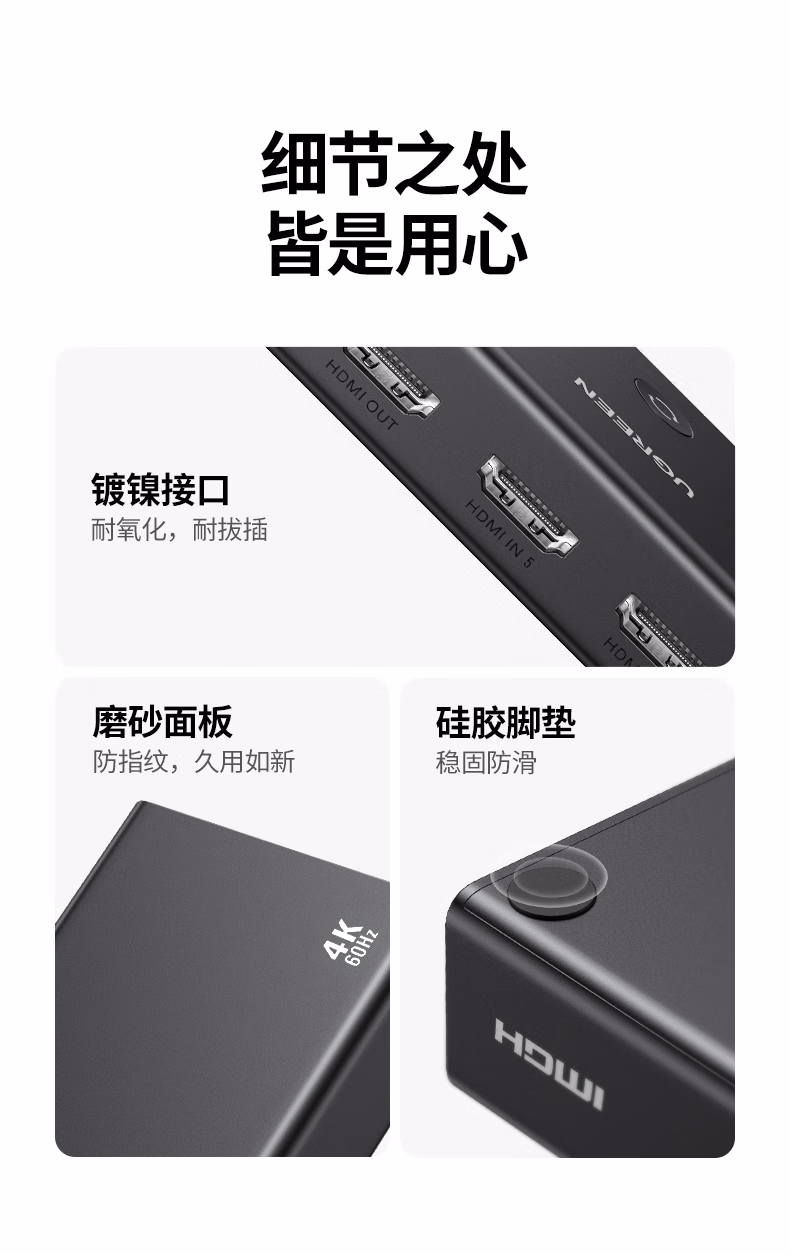 包装清单  :   绿联HDMI2.0切换器5进1出4K60Hz五进一出高清视频切屏笔记本电脑接电视显示器投影仪兼容三进一出90802