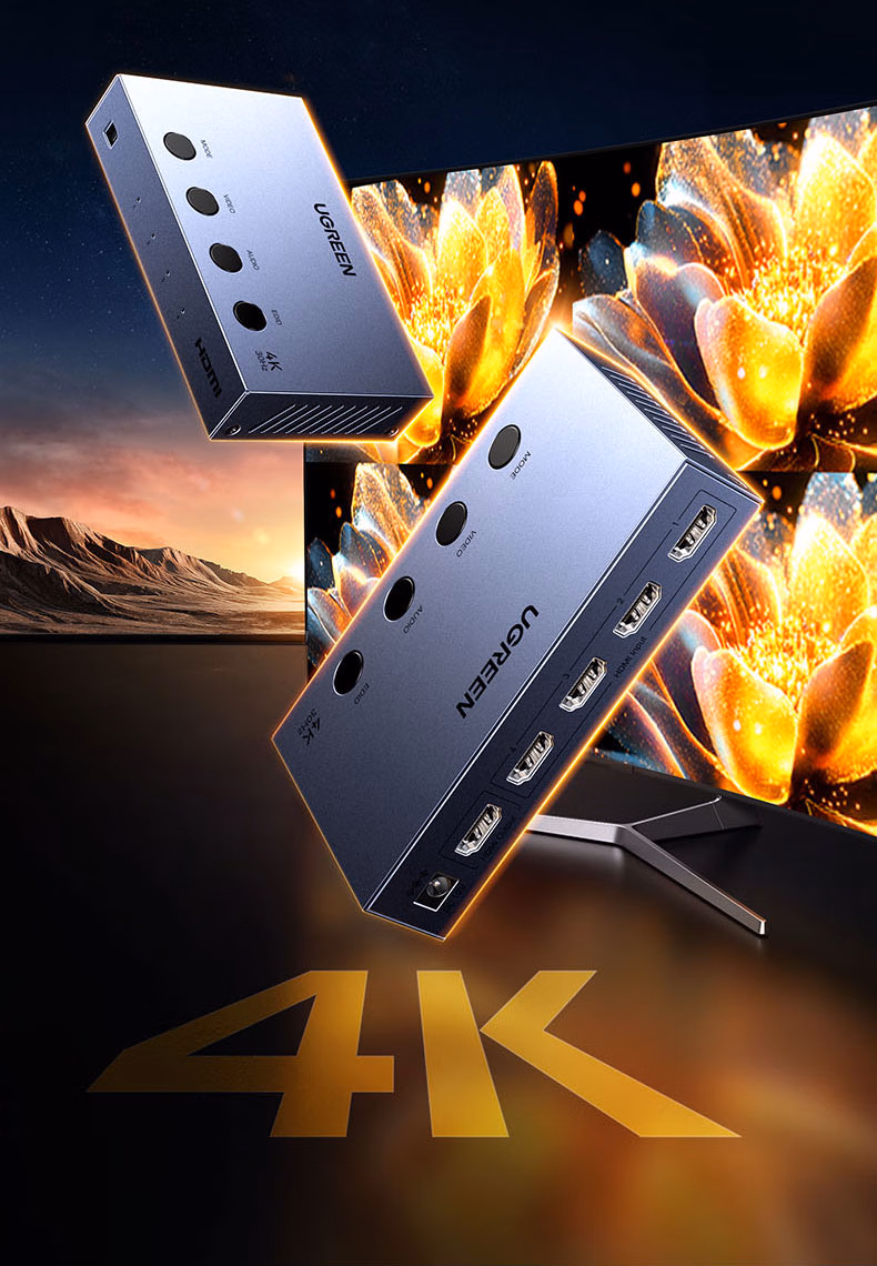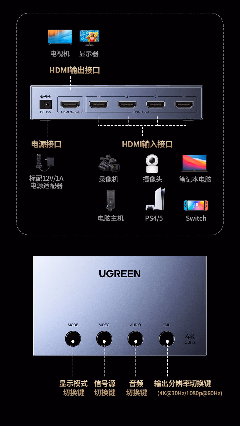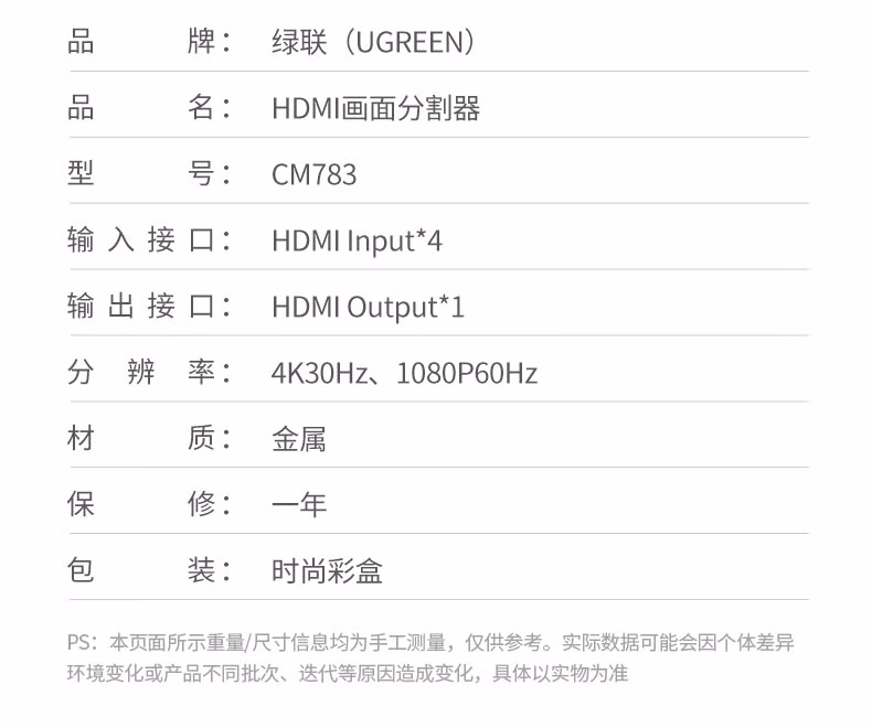 包装清单  :   绿联HDMI画面分割器4K高清四进一出切换分屏视频拼接4进1出 游戏监控摄像头电脑接显示器屏幕55498