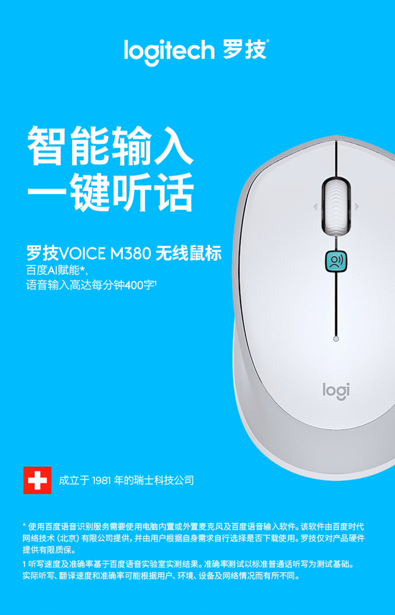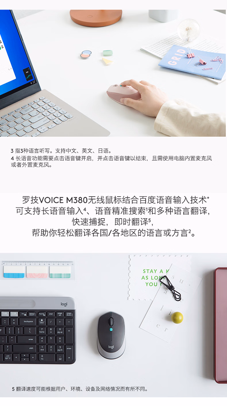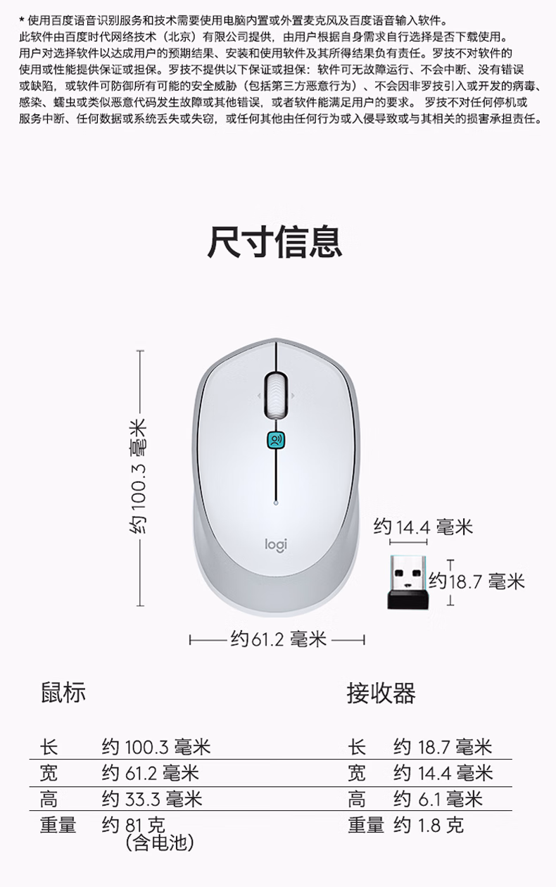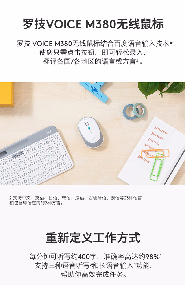包装清单  :   罗技(Logitech) M380 无线鼠标 无线2.4G 办公鼠标 百度AI智能语音输入打字翻译 家用办公型M380 珍珠白