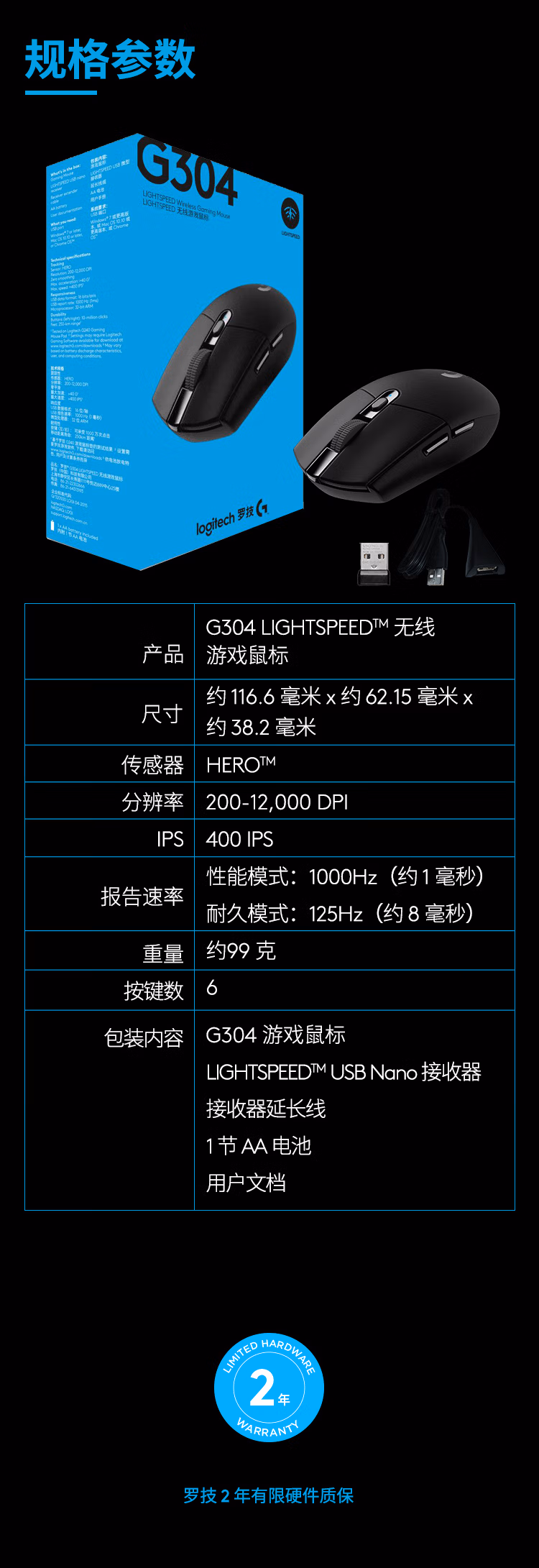 包装清单  :   罗技/Logitech G304 鼠标 304 LIGHTSPEED无线鼠标 游戏鼠标 轻质便携 鼠标宏 黑色