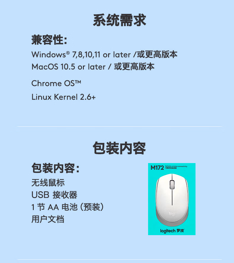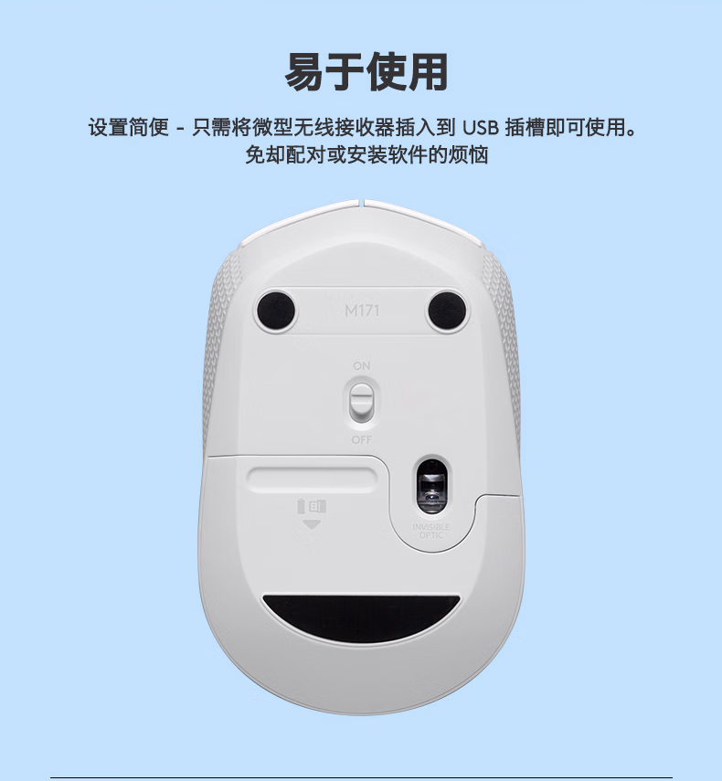 包装清单  :   罗技(Logitech)M172鼠标 无线鼠标 办公鼠标 左右手适用 双侧防滑纹理 带无线2.4G接收器 珍珠白