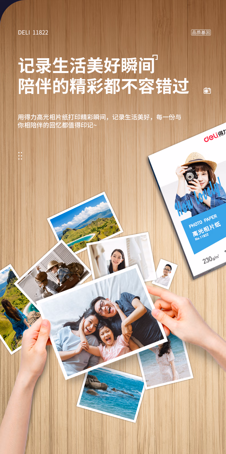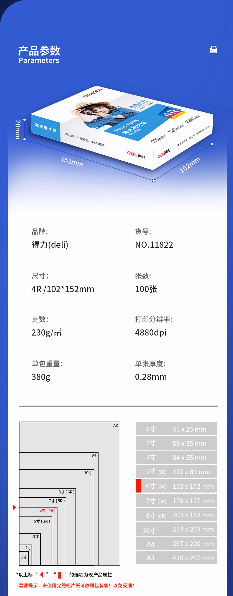 包装清单  :   得力(deli)6英寸 230g高光面照片纸 相片打印纸 100张/包 11822