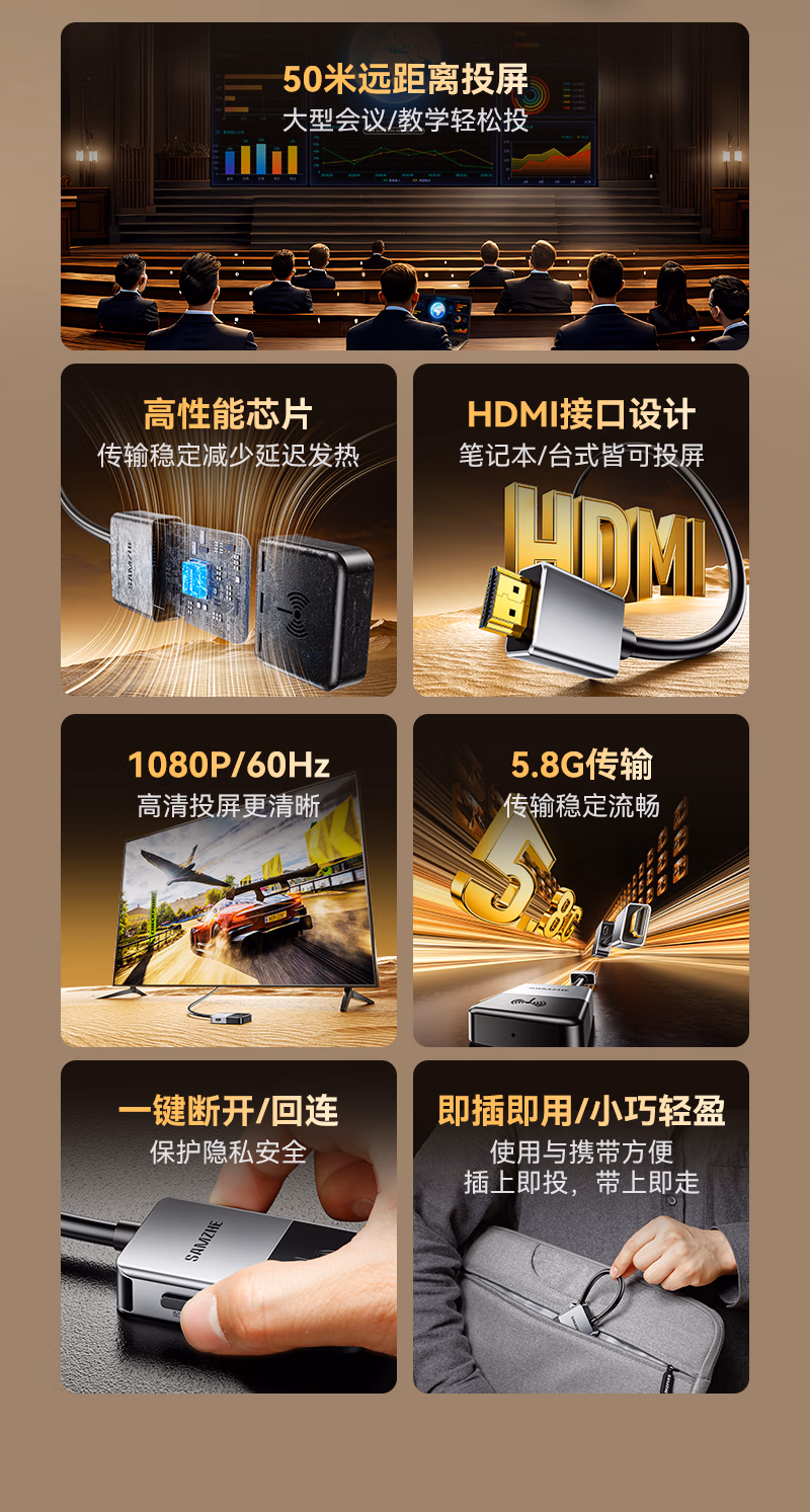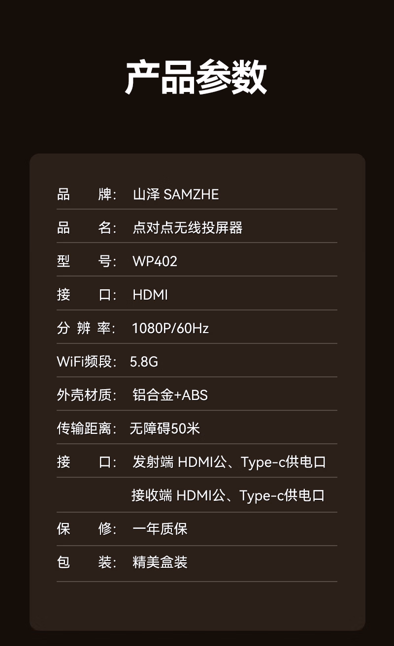 包装清单  :   山泽HDMI无线投屏器高清会议同屏器适用笔记本电脑台式机接电视显示器投影仪点对点50米传输器WP402