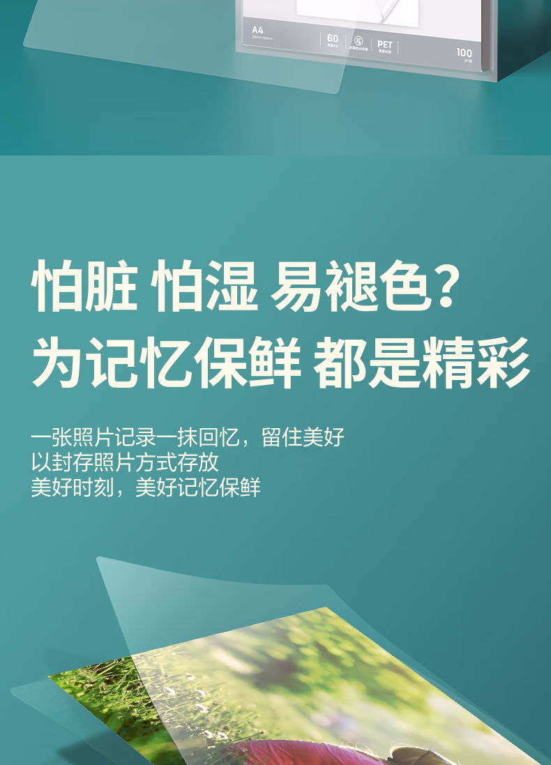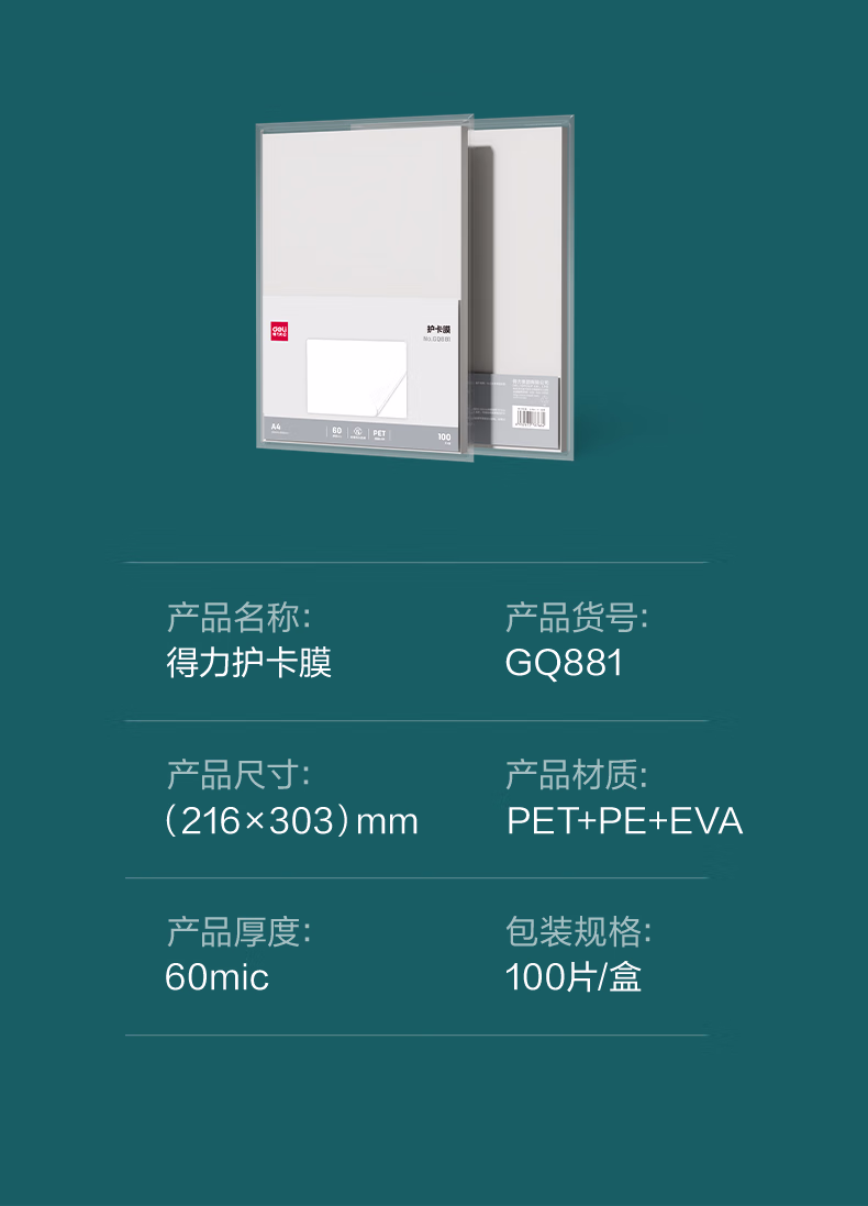 包装清单  :   得力 塑封膜a4 照片过塑膜 文件过塑机塑封机膜专用护卡膜/塑封纸 220*305mm 100张/包 60厚度 GQ881