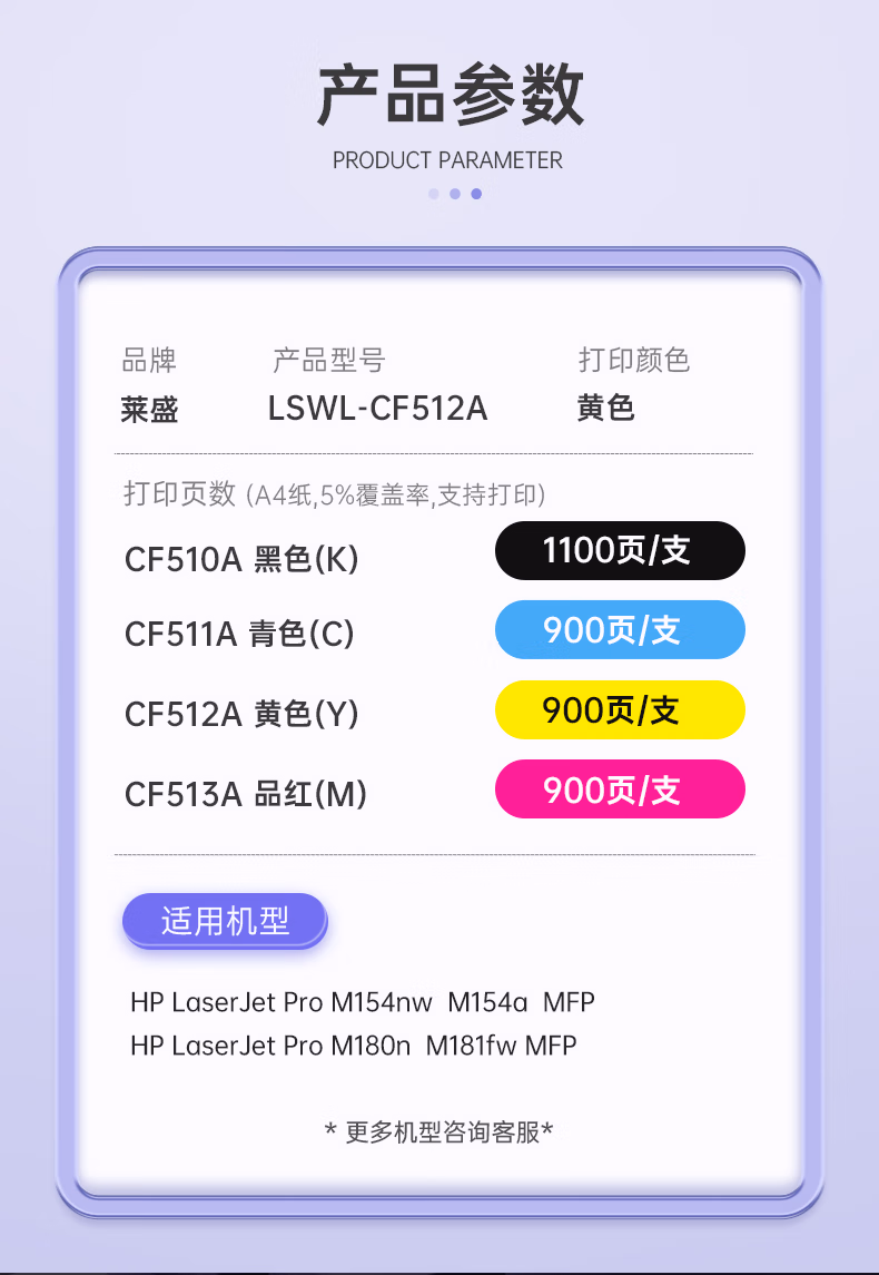 包装清单  :   莱盛LSWL-CF512A黄色硒鼓 204A有芯片粉盒 适用惠普HP CLJ Pro M154a M154nw M180n M181fw MFP 彩色打印机墨盒