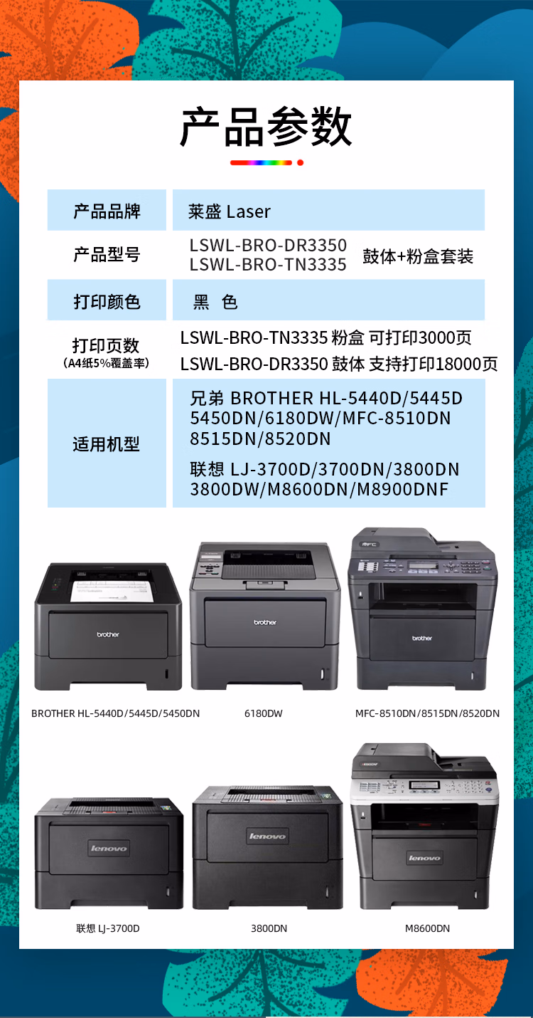 包装清单  :   莱盛TN3335粉盒 适用兄弟HL-5440D 5445D 5450DN 6180DW DR3350鼓体 【TN3335粉盒】3000页×1支