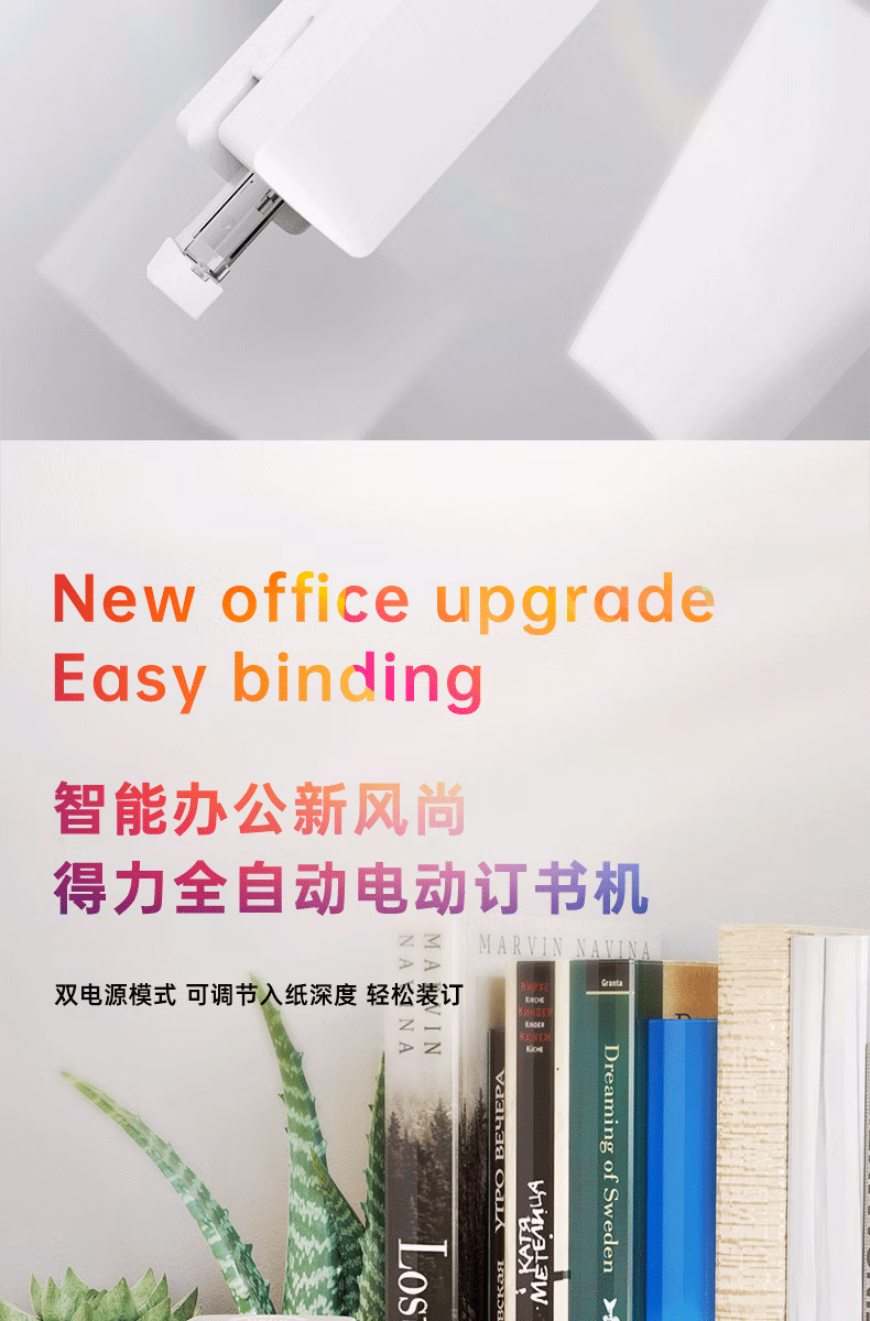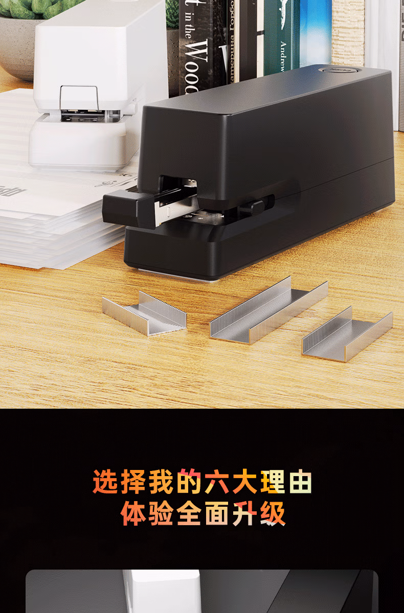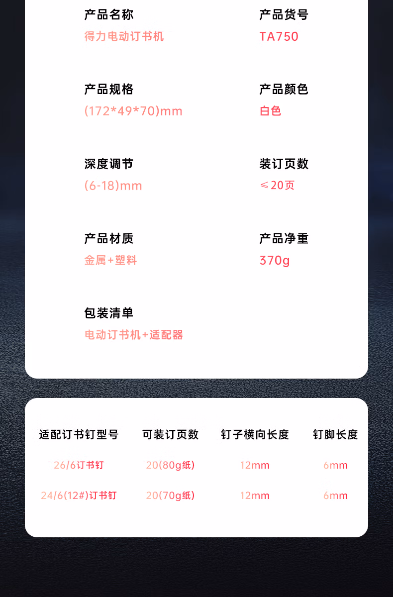 包装清单  :   得力(deli)双电源电动订书机 电子自动装订订书器 适配24/6或26/6订书钉 办公用品 白色 TA750