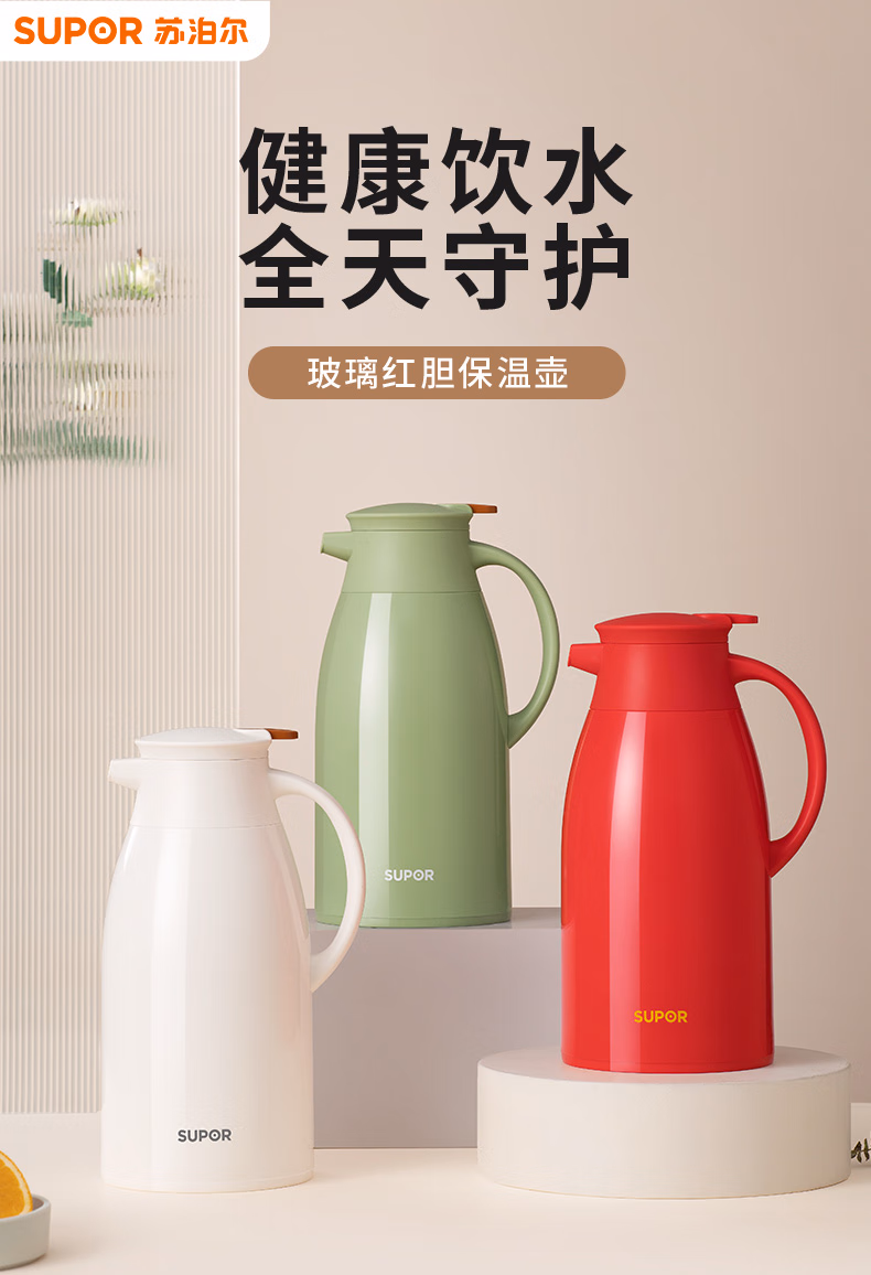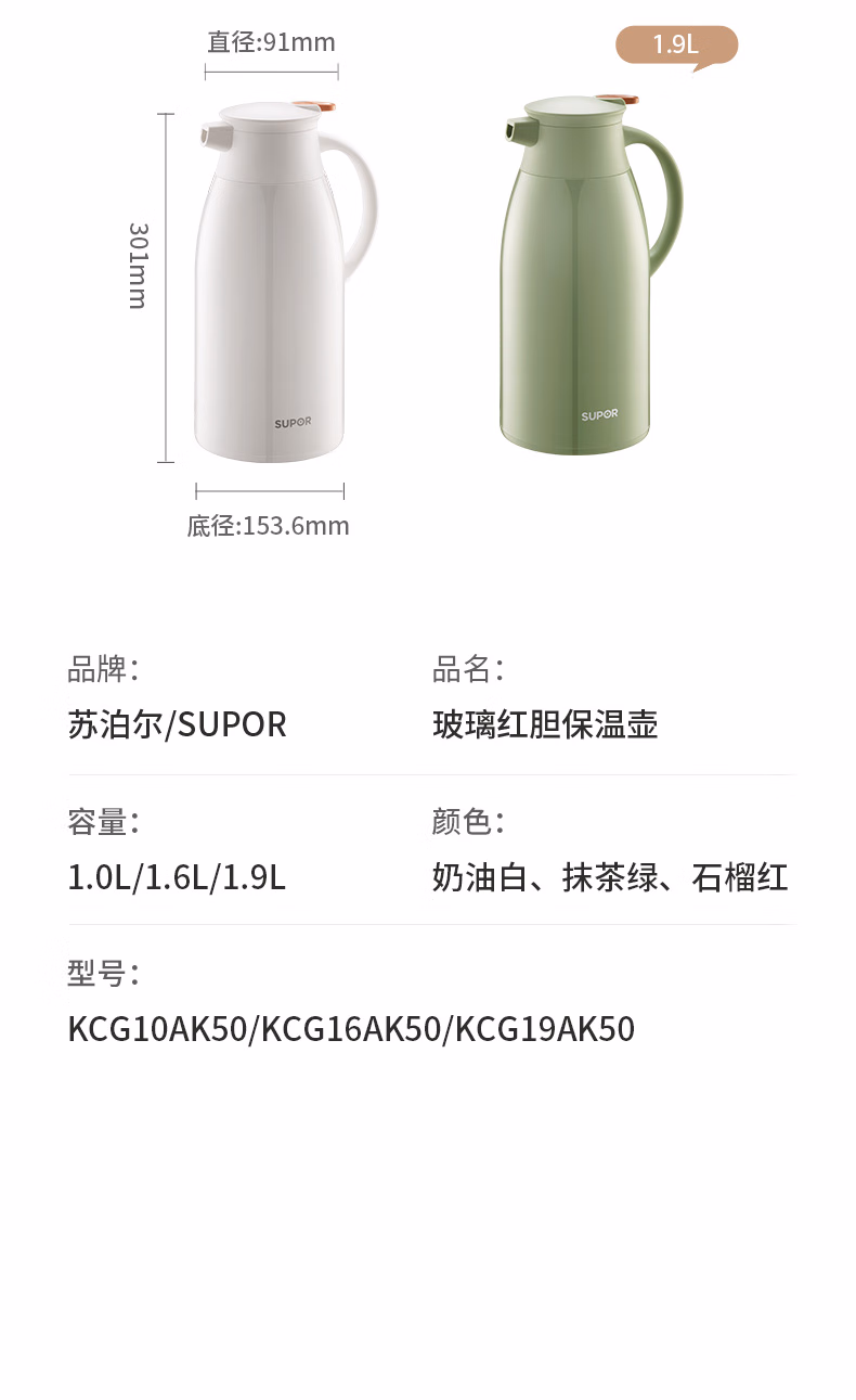 包装清单  :   苏泊尔(SUPOR)保温壶玻璃内胆热水壶家用保温水壶暖水瓶大容量开水壶温水瓶 【玻璃红胆】奶油白 1.9L