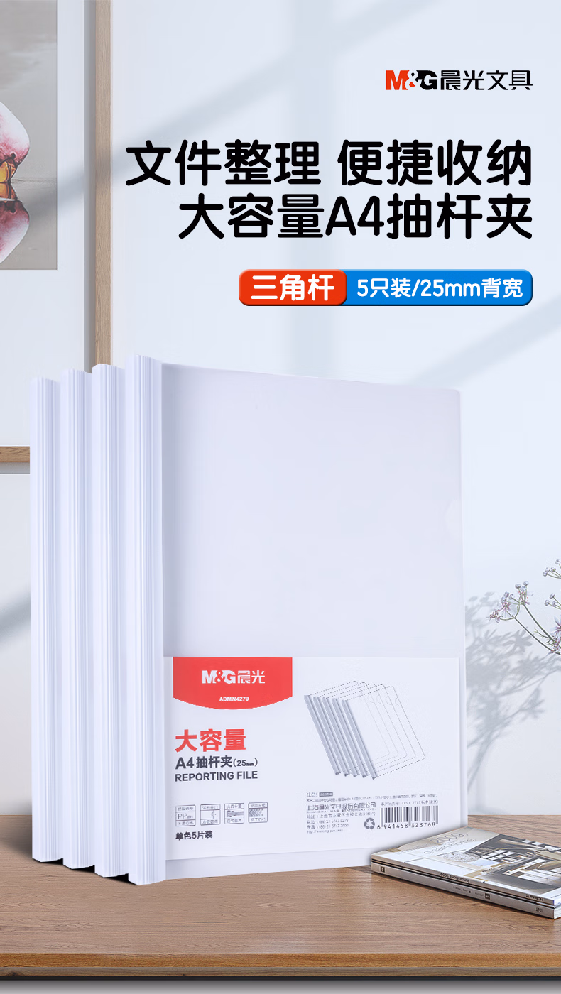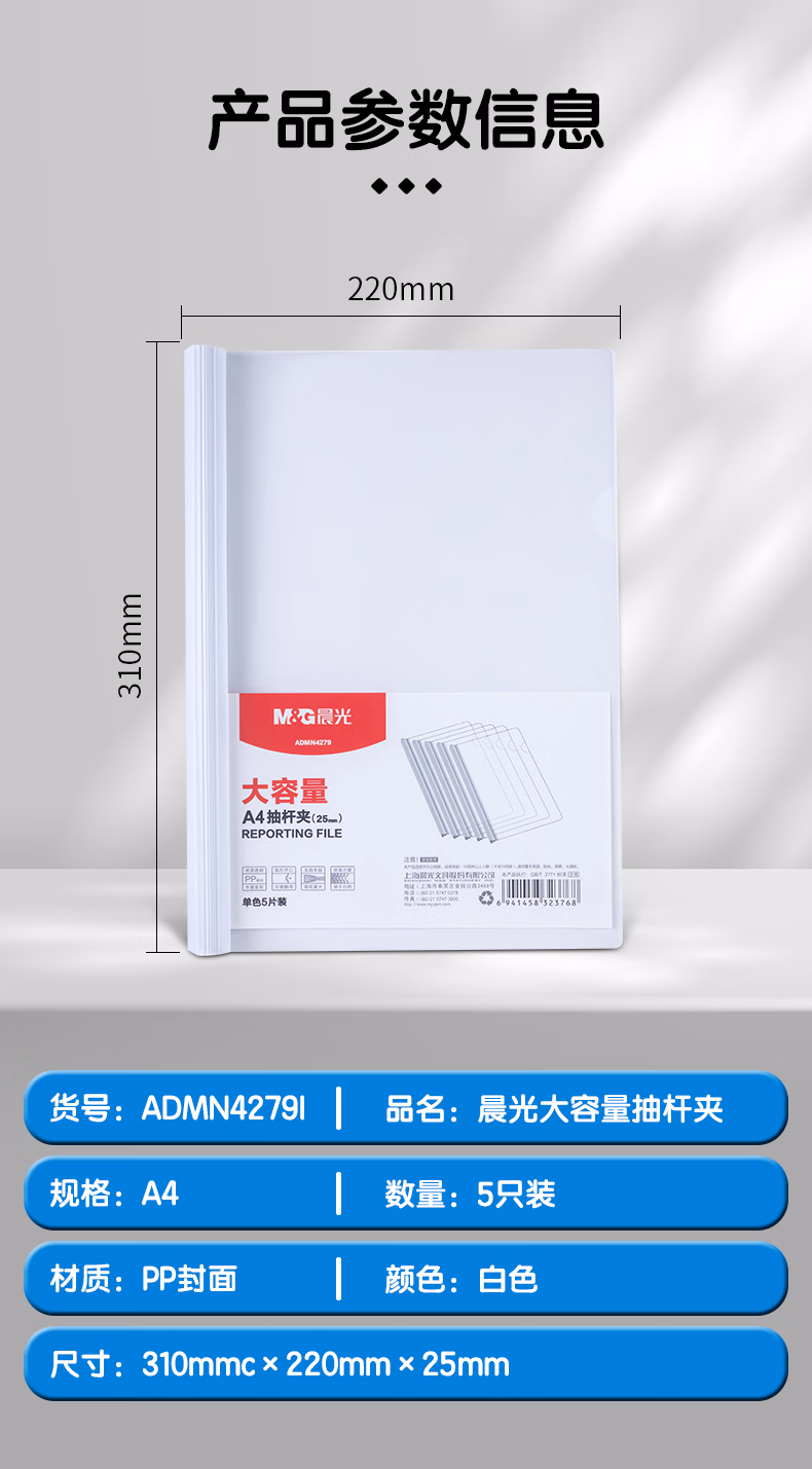 包装清单  :   晨光(M&G)文具 5个装A4/25mm透明抽杆夹 大容量办公报告收纳拉杆夹 资料整理收纳文件夹ADMN4279I