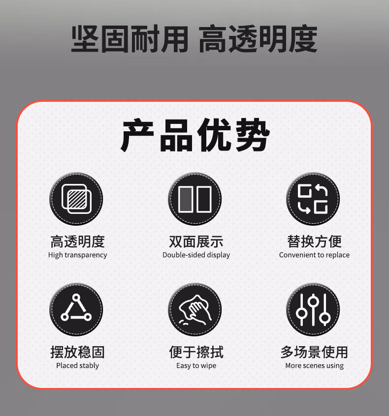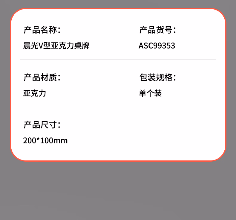 产品材质  :   V型台卡 亚克力桌牌展示牌席卡壳立牌200*100mm 台签会议席位卡 座位牌广告展示牌 单个装ASC99353