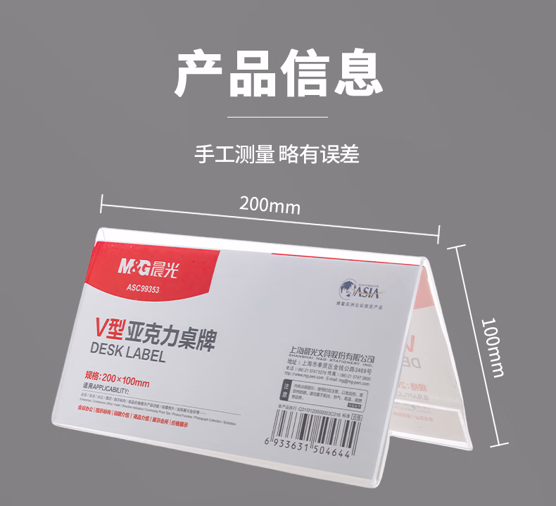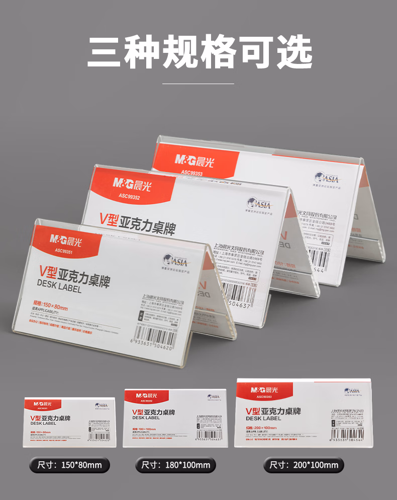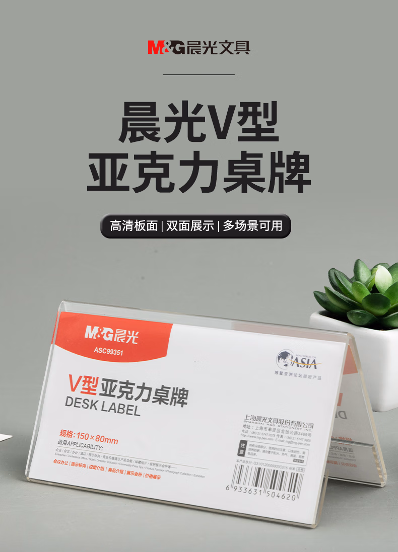 包装清单  :   晨光(M&G)V型台卡 亚克力桌牌展示牌席卡壳立牌200*100mm 台签会议席位卡 座位牌广告展示牌 单个装ASC99353