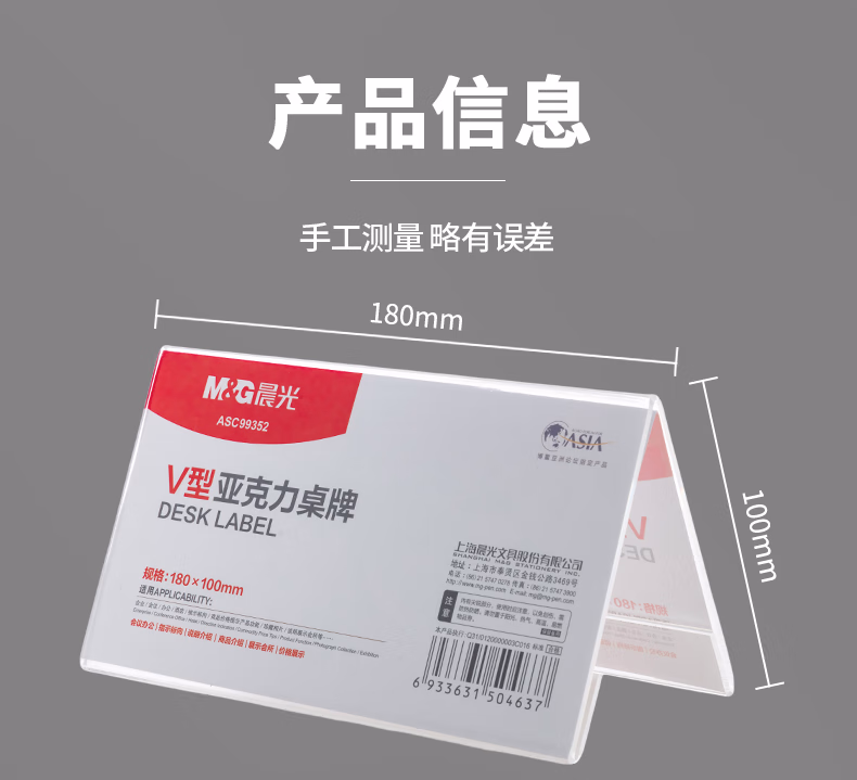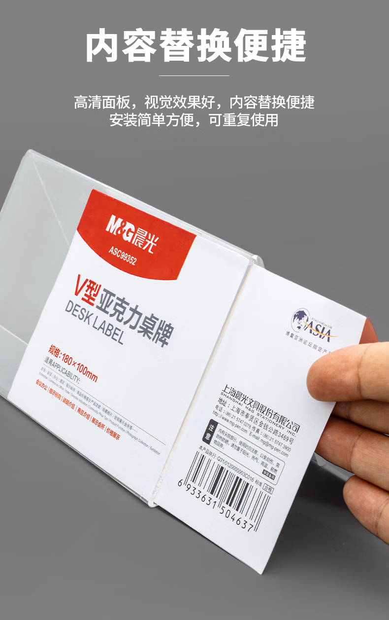 包装清单  :   晨光(M&G)V型台卡 亚克力桌牌展示牌席卡壳立牌180*100mm 会议席位卡 座位牌广告展示牌 单个装ASC99352