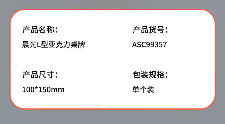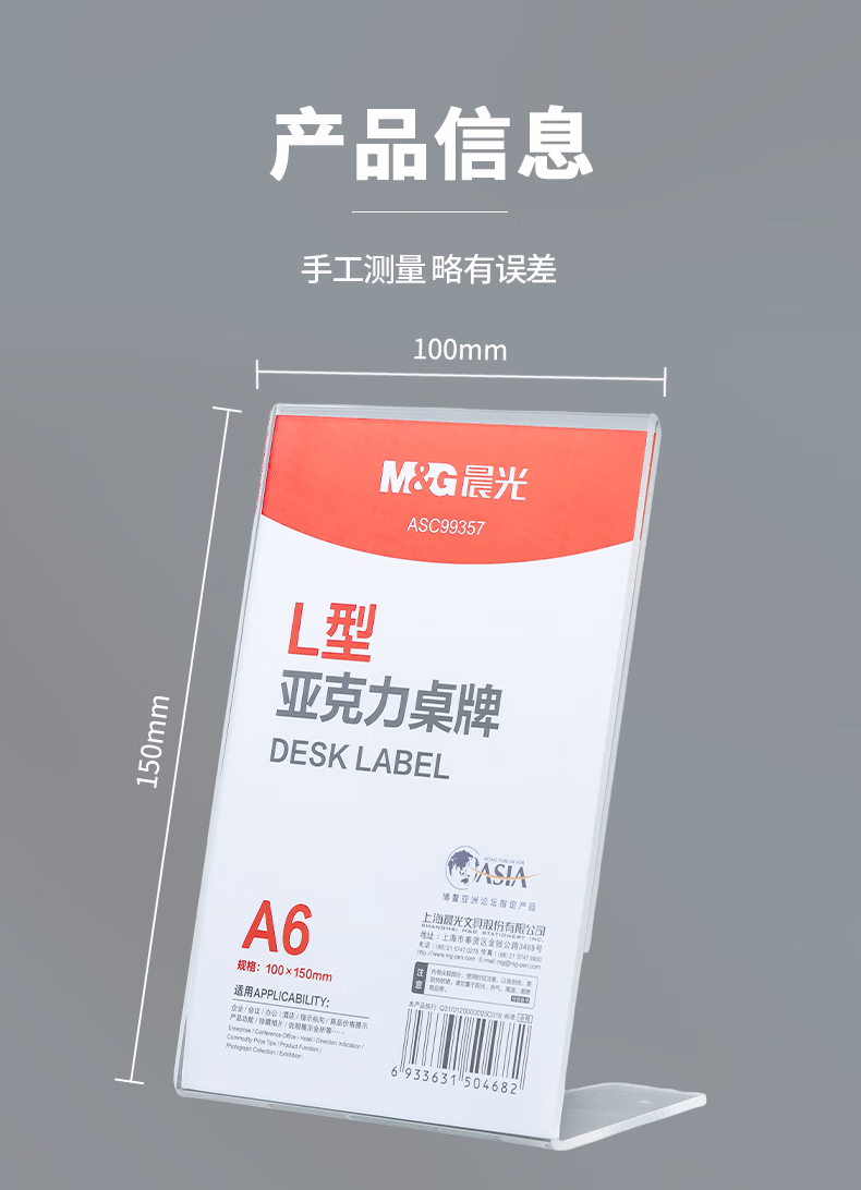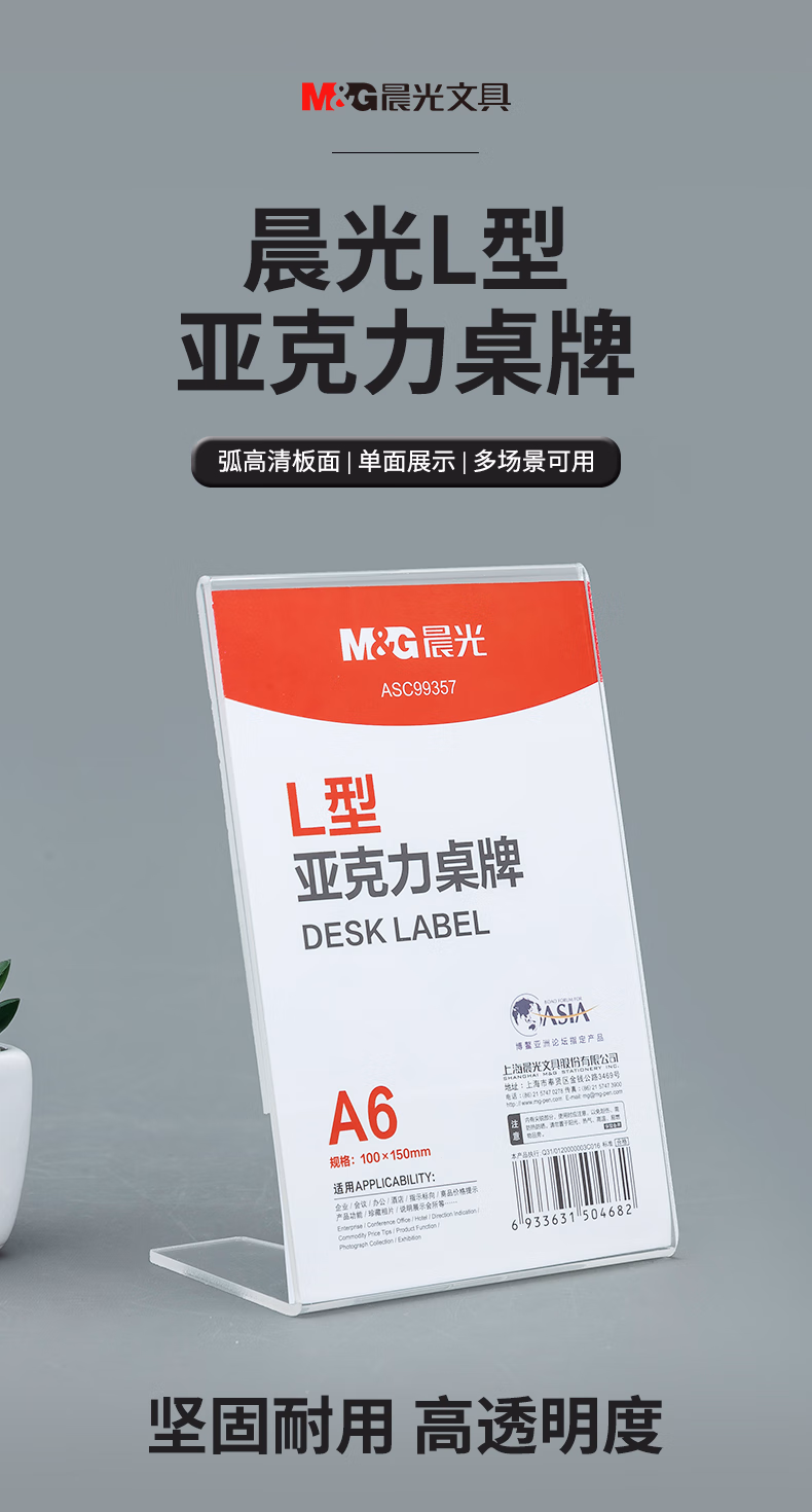 包装清单  :   晨光(M&G)L型桌牌 会议桌牌A6台签100*150mm竖式亚克力立式台签台牌台卡 单个装 ASC99357 单个装