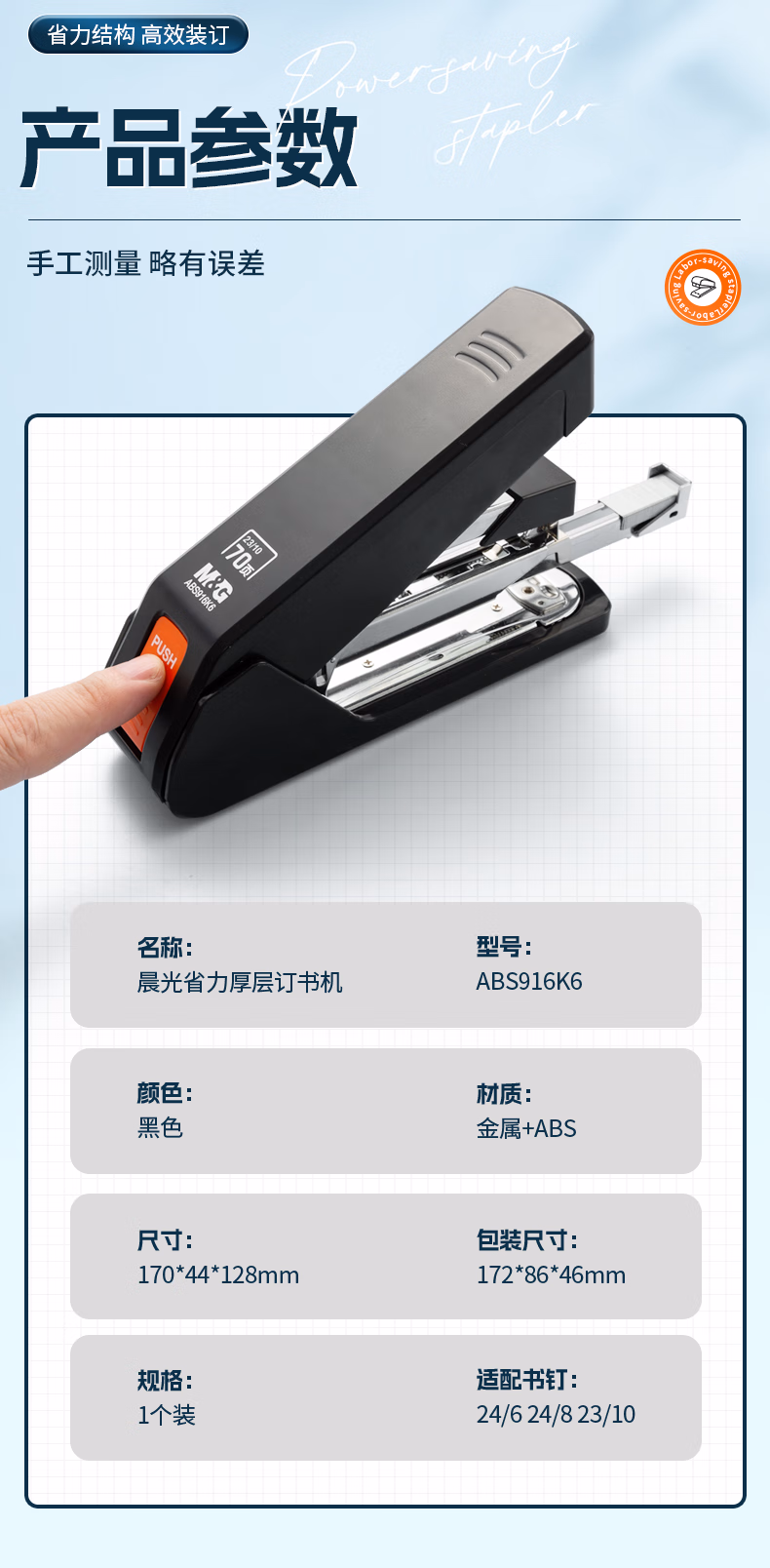 包装清单  :   晨光(M&G)70页省力厚层大订书机 重型装订订书器 办公通用试卷文件装订机 黑色 ABS916K6