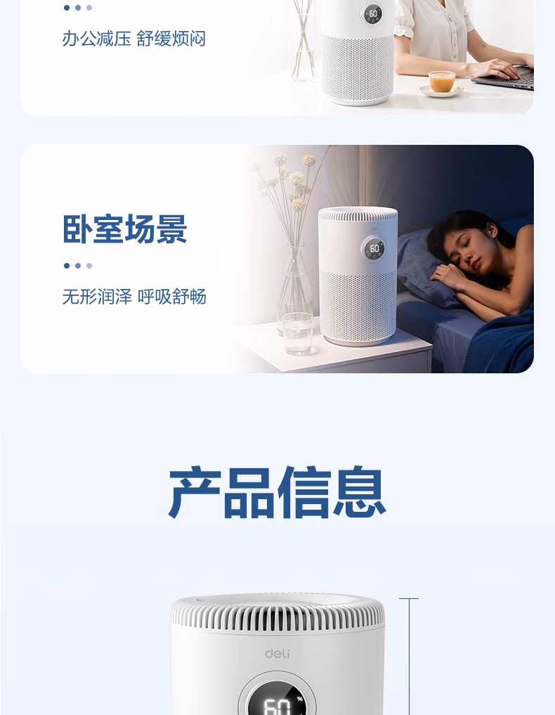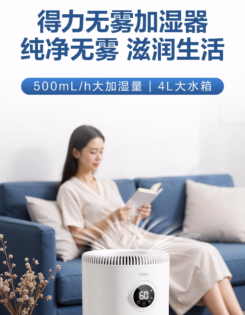 包装清单  :   得力(deli)空气无雾加湿器家用卧室静音除菌宿舍办公桌面雾化器温湿度数显 五档可调 轻音运行