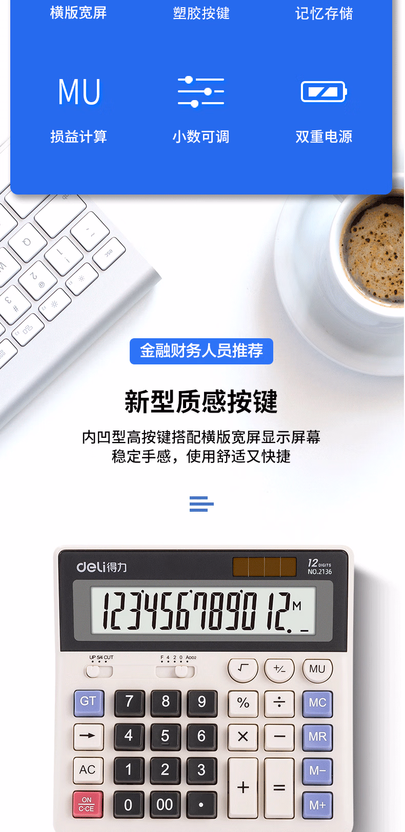包装清单  :   得力(deli)双电源电脑按键计算器 12位大屏横式桌面计算机 金融财务 办公用品 白色2136