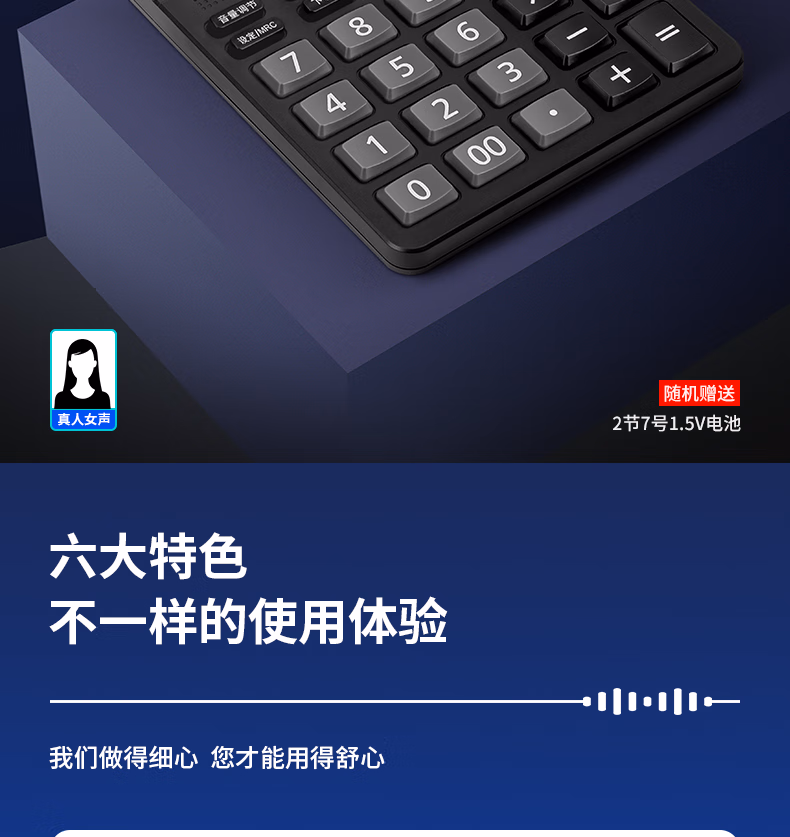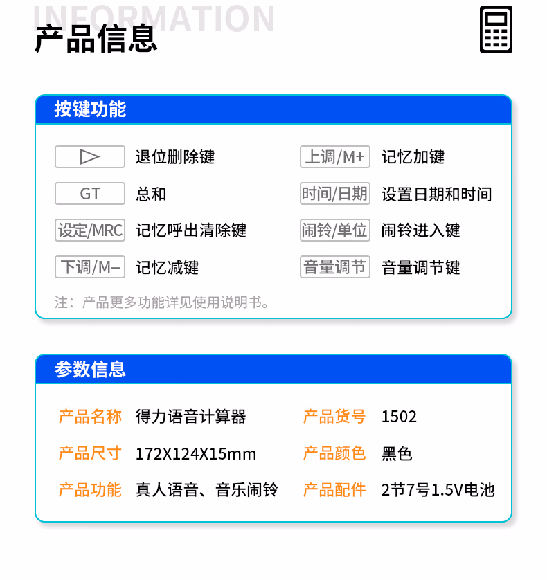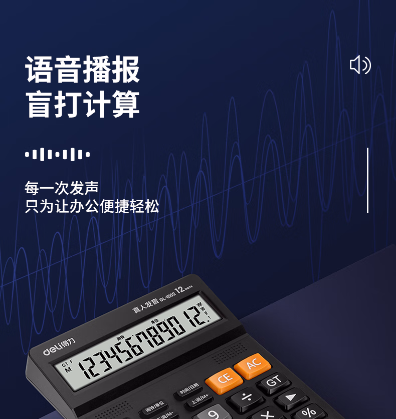 包装清单  :   得力(deli)12位财务商超通用语音计算机 桌面语音计算器 学生/办公口算 黑色1502
