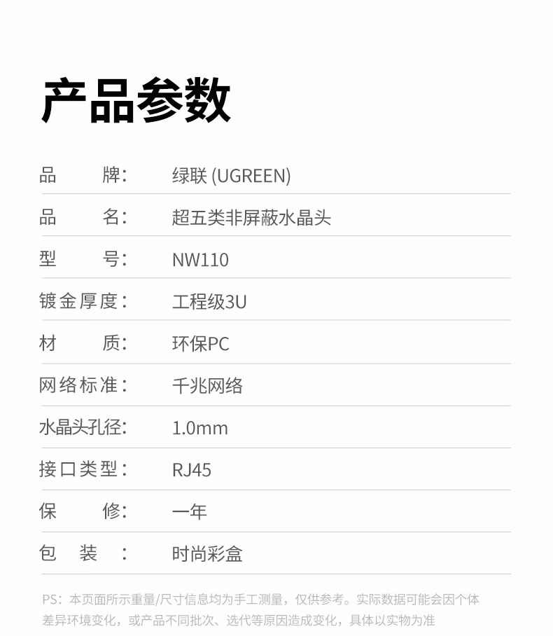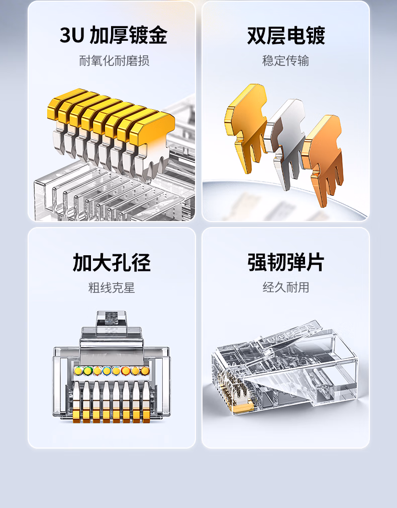 包装清单  :   超五类网线水晶头 超5类千兆网络接头镀金工程级RJ45电脑网线连接器 CAT5E非屏蔽水晶头50个 20331