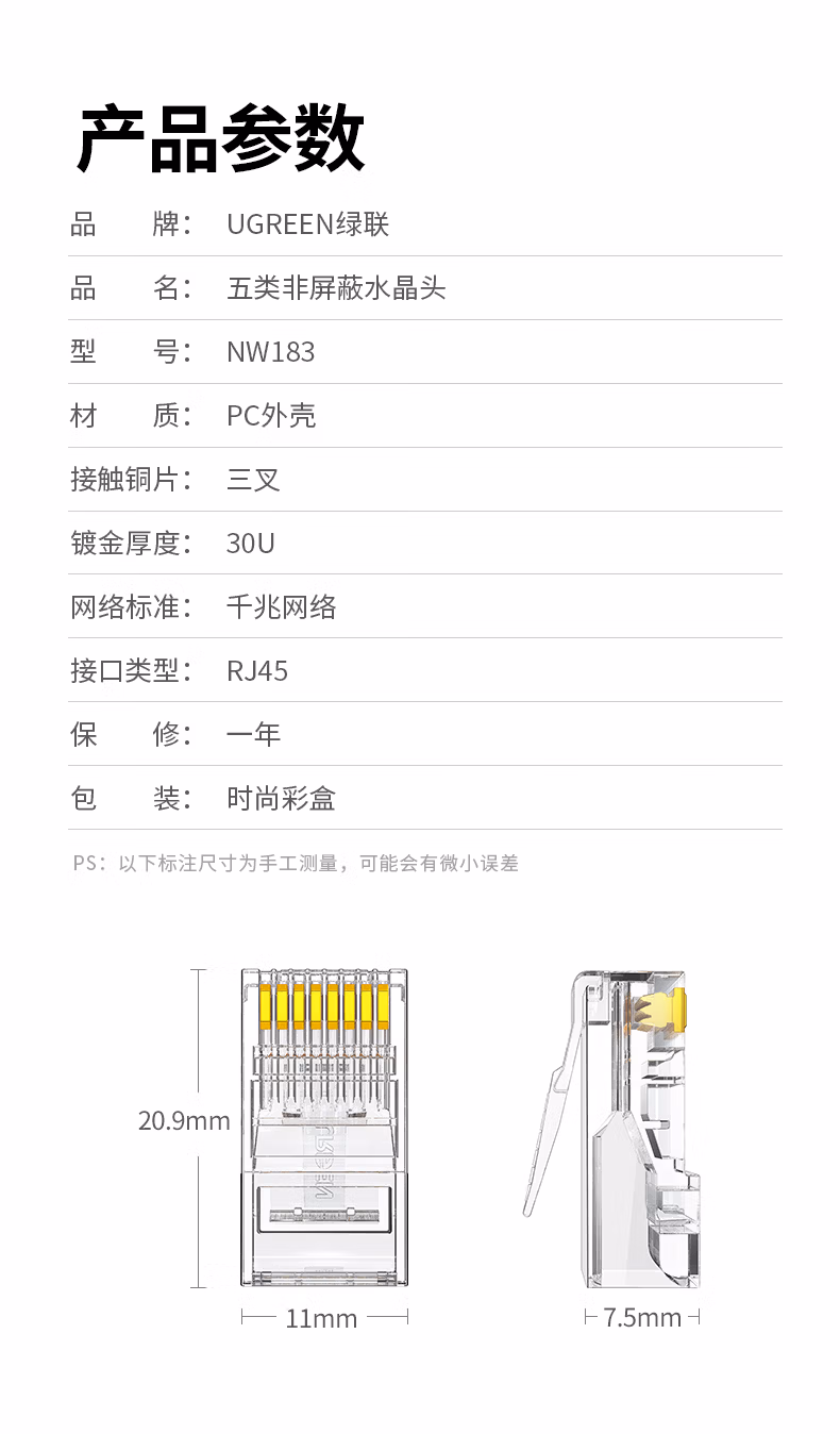包装清单  :   超五类网线水晶头 超5类千兆网络接头 30U镀金工程级RJ45电脑网线连接器CAT5E非屏蔽水晶头100个