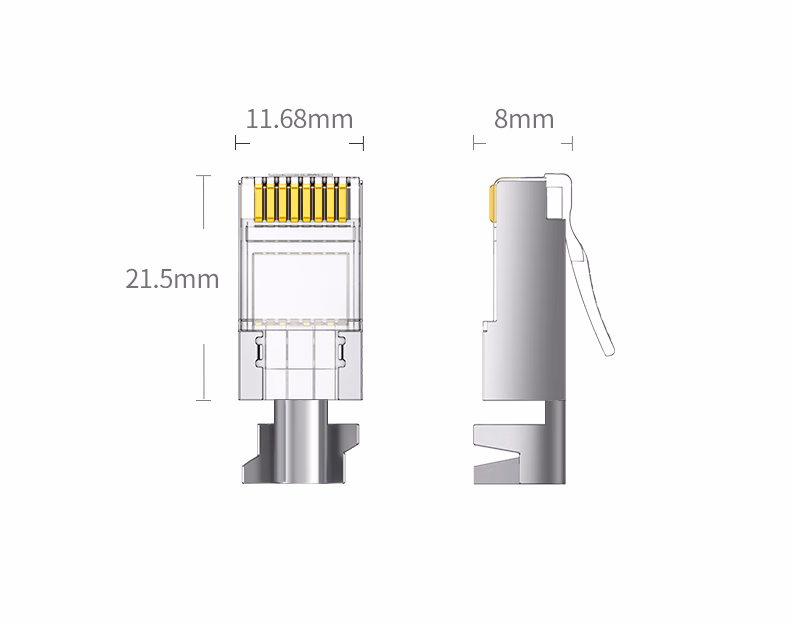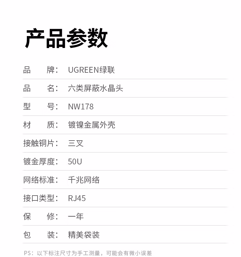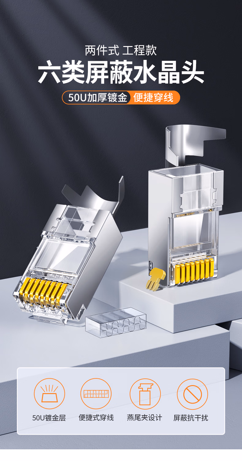 包装清单  :   六类网线屏蔽水晶头 6类千兆网络接头 50U镀金工程级RJ45电脑网线连接器CAT6两件式接头 100个