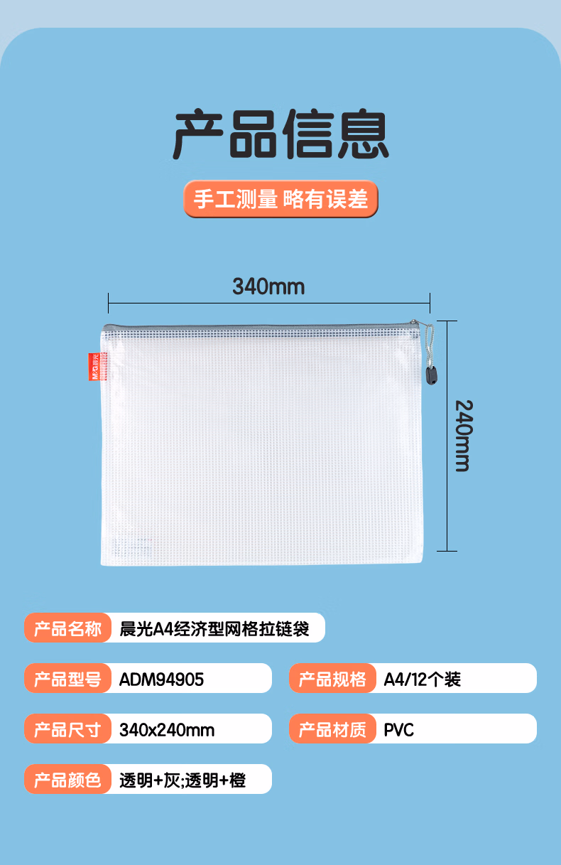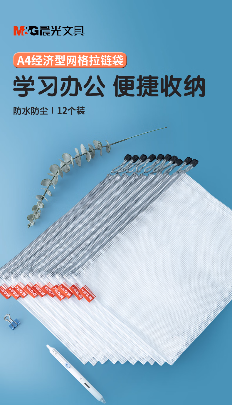 包装清单  :   晨光(M&G)文具 经济型网格拉链袋A4/12个装文件整理收纳袋 ADM94905