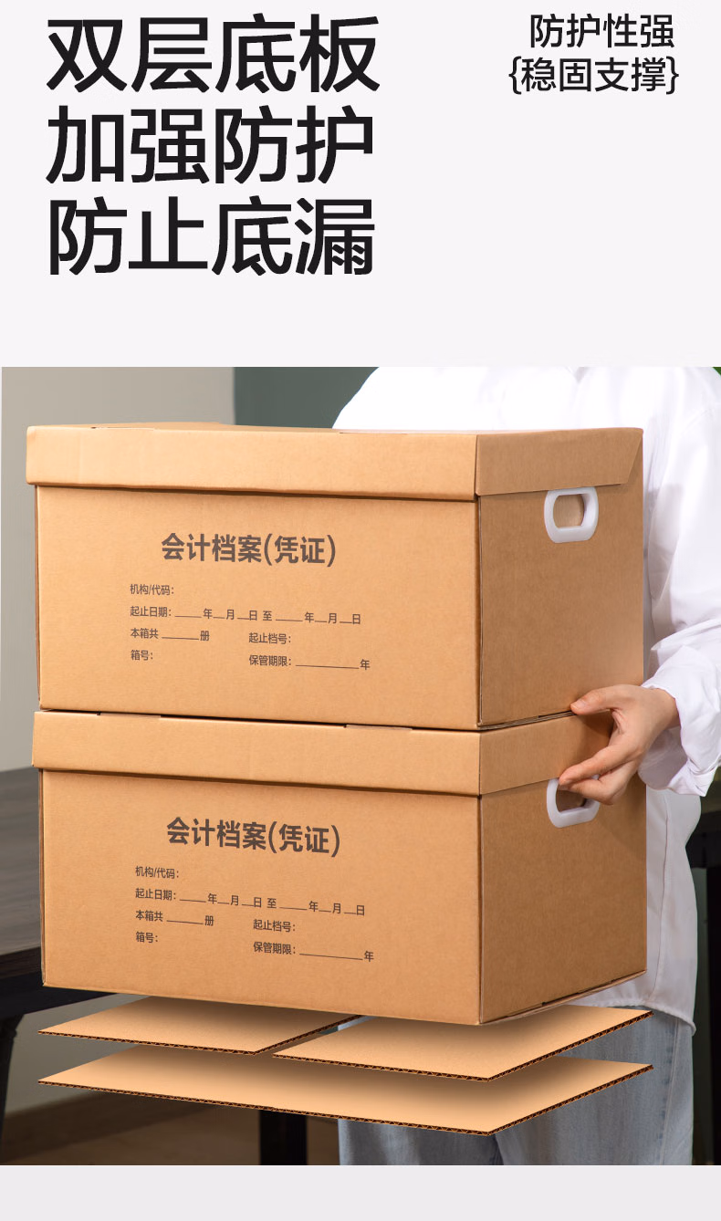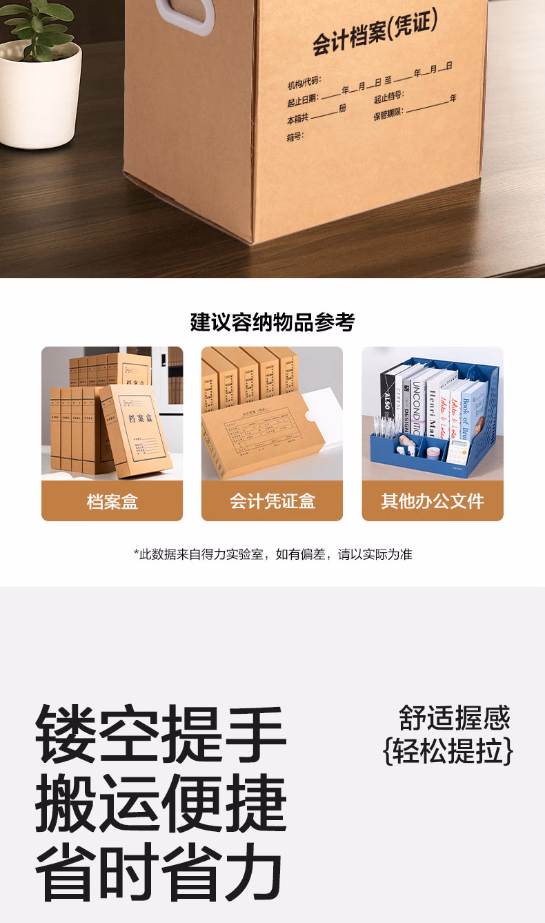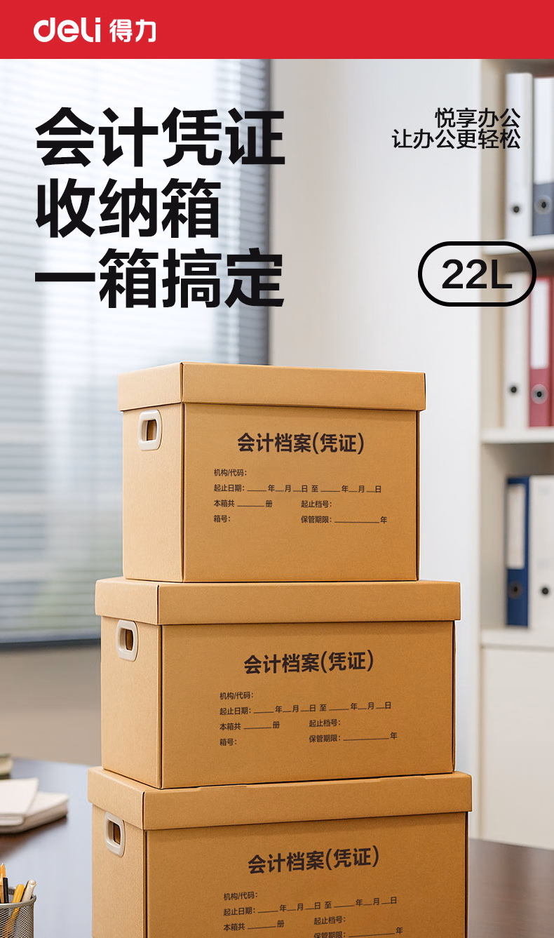 包装清单  :   得力(deli)会计凭证箱无酸牛皮纸档案箱三层加厚 340*240*300 纸箱财会凭证发票文件资料收纳箱 5个装PK160