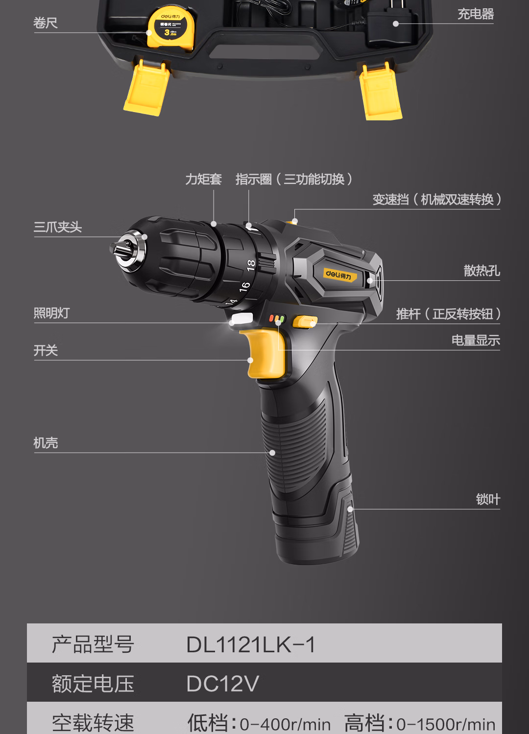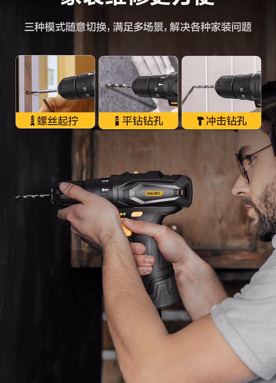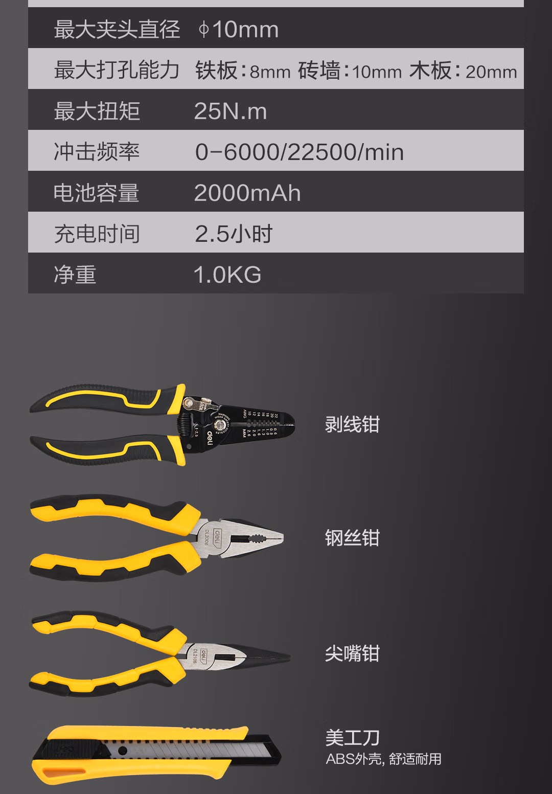 包装清单  :   得力(deli)锂电冲击钻家用手电钻电动工具箱套装维修组合多功能套装