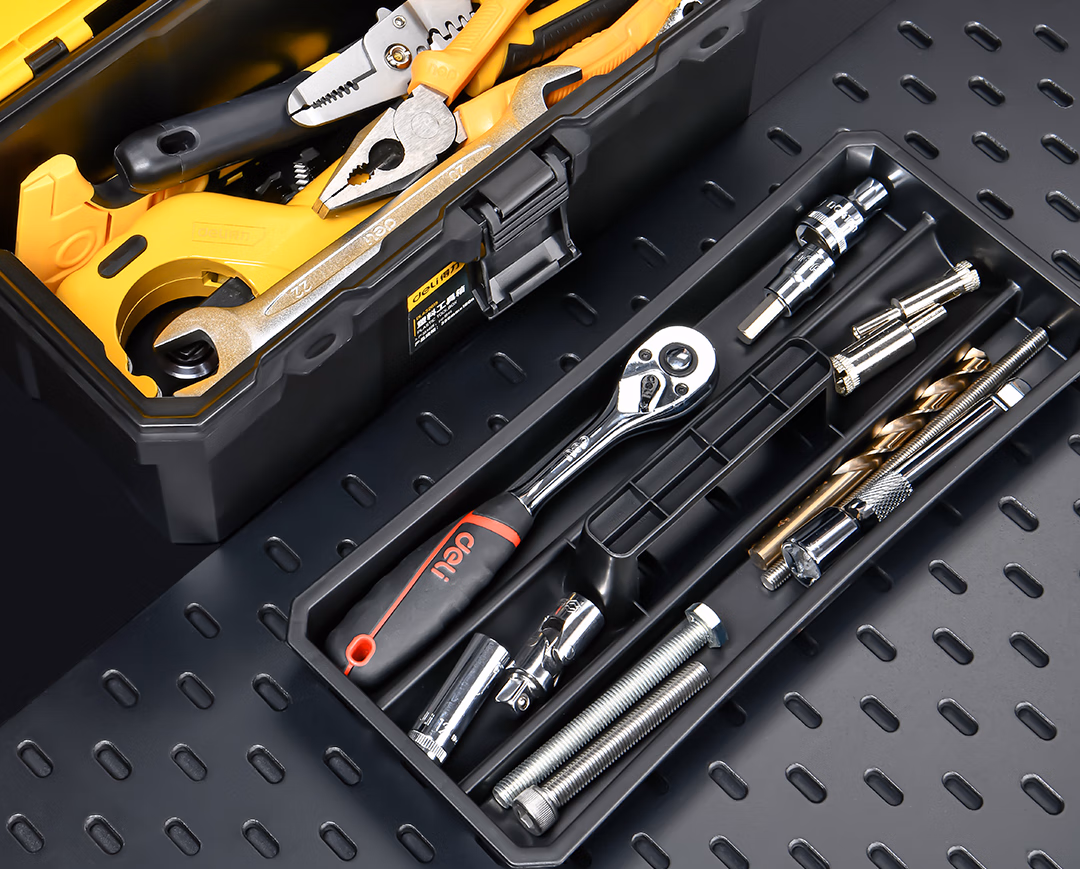 包装清单  :   得力(deli)加强型工具箱空箱塑料收纳箱多功能维修家用五金收纳盒15英寸