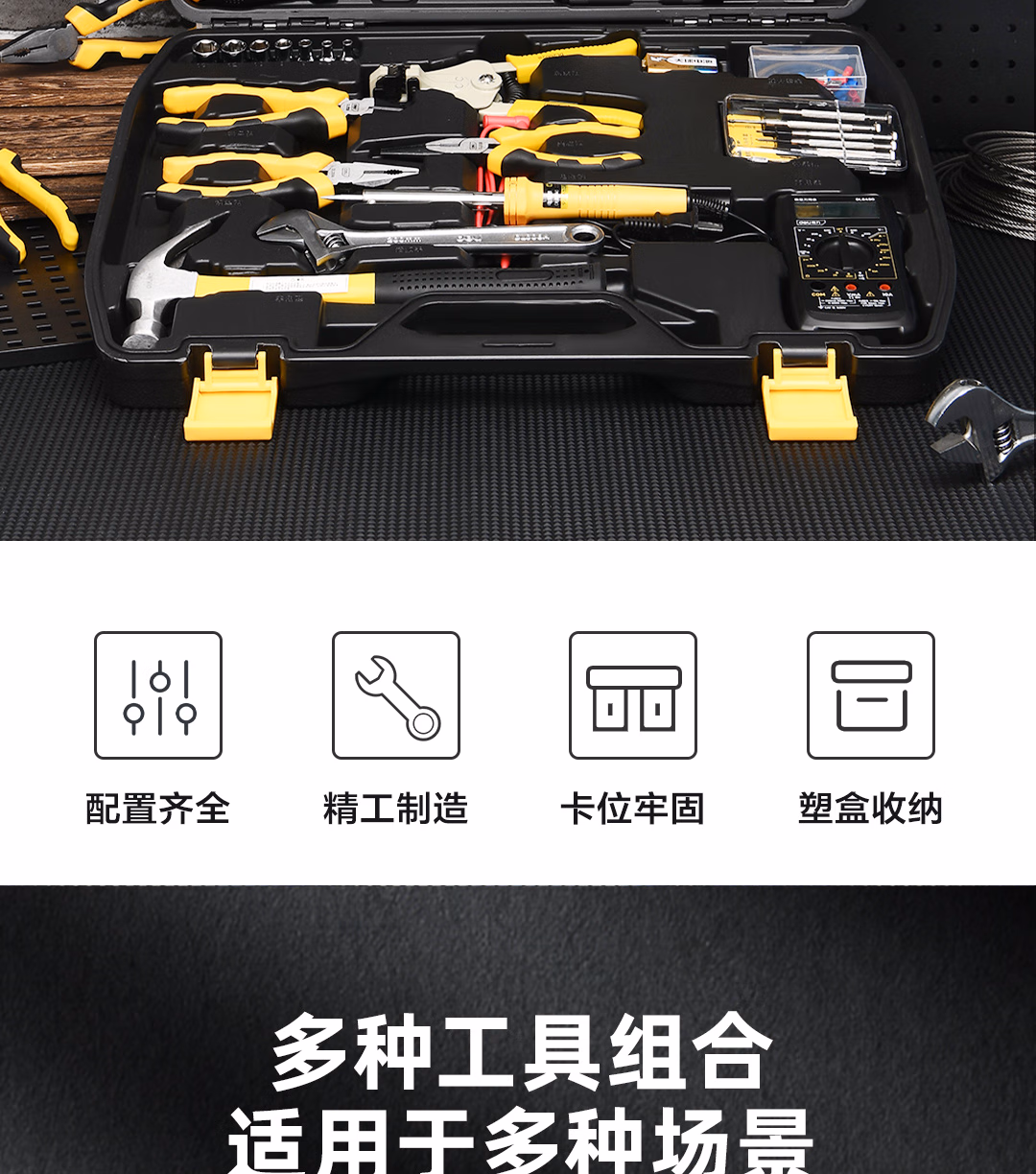 包装清单  :   得力(deli)家用五金工具箱套装电讯43件套钟表批电工木工综合维修组套