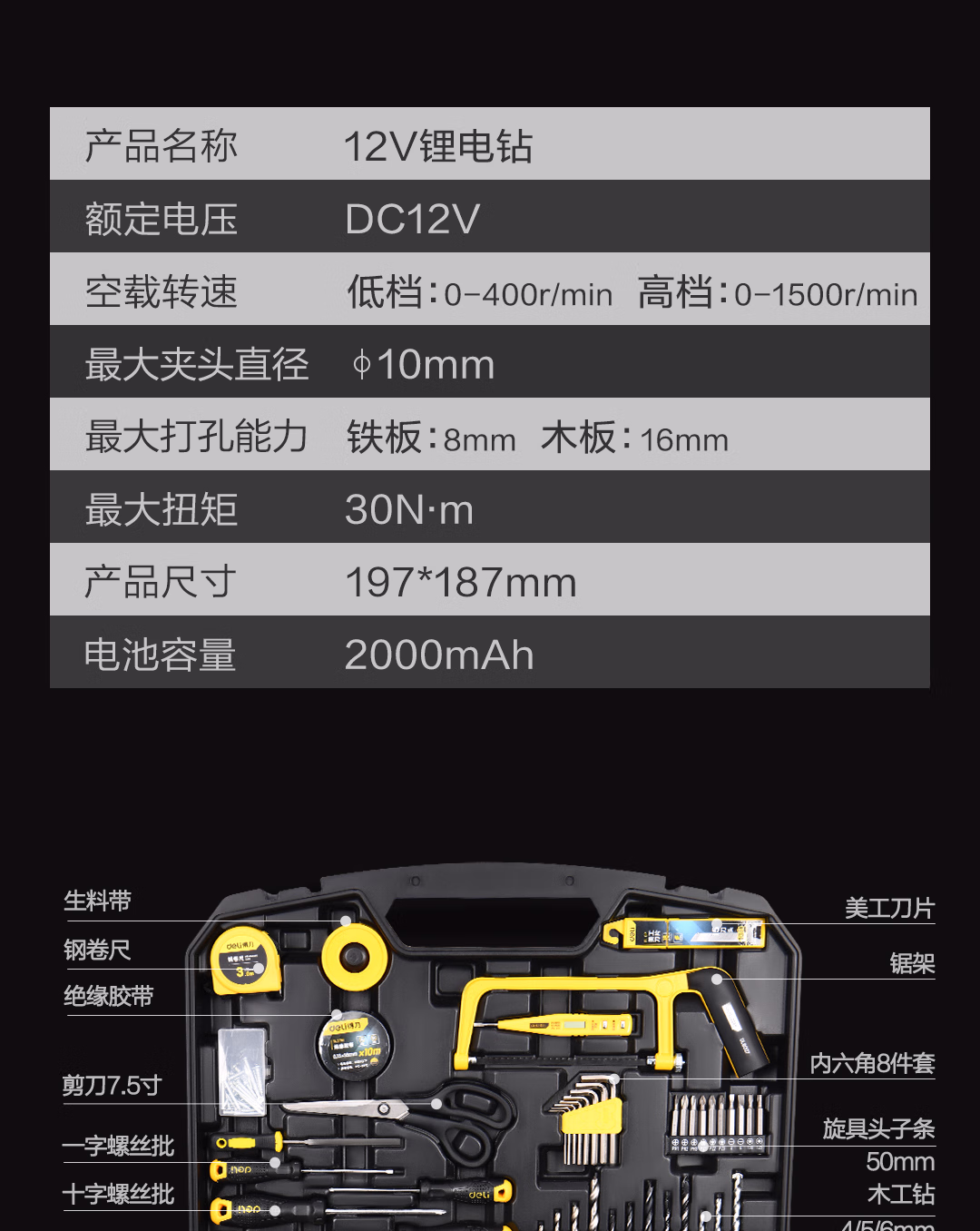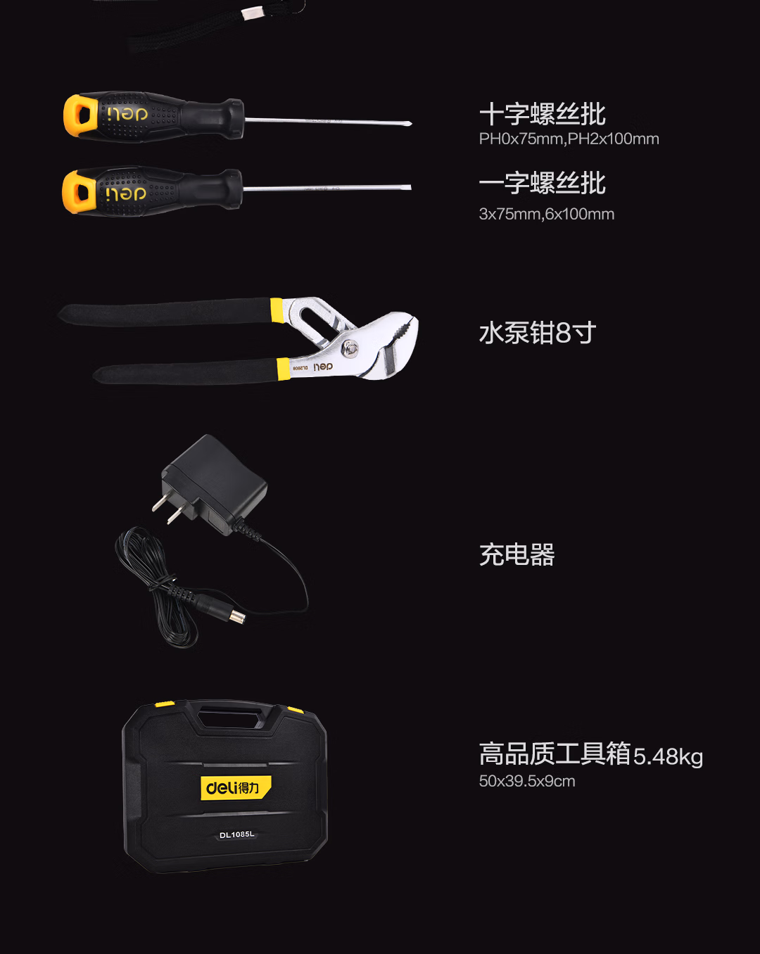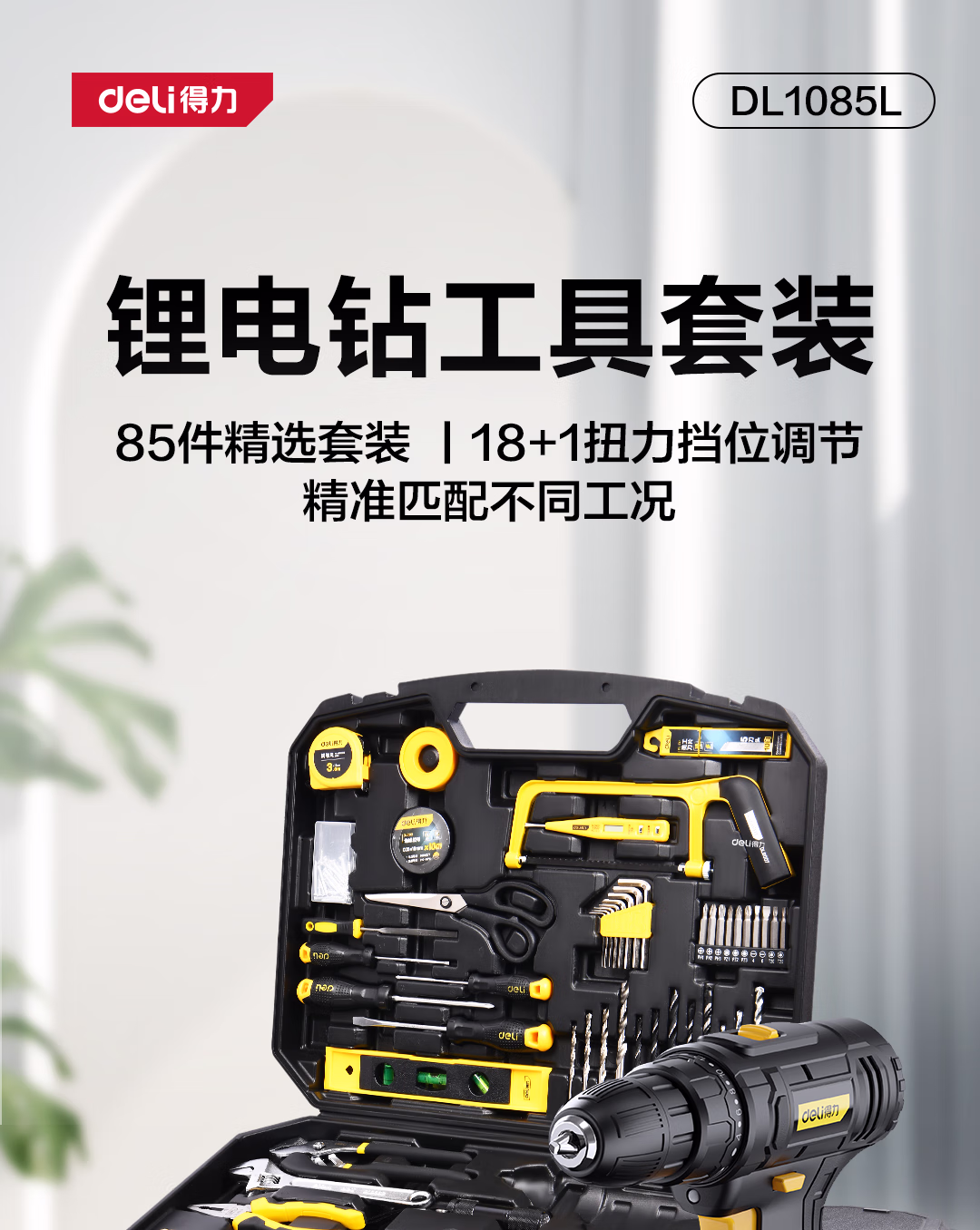 包装清单  :   得力(deli)85件套手电钻锂电钻组合充电式手钻电起子电批多功能电动工具箱