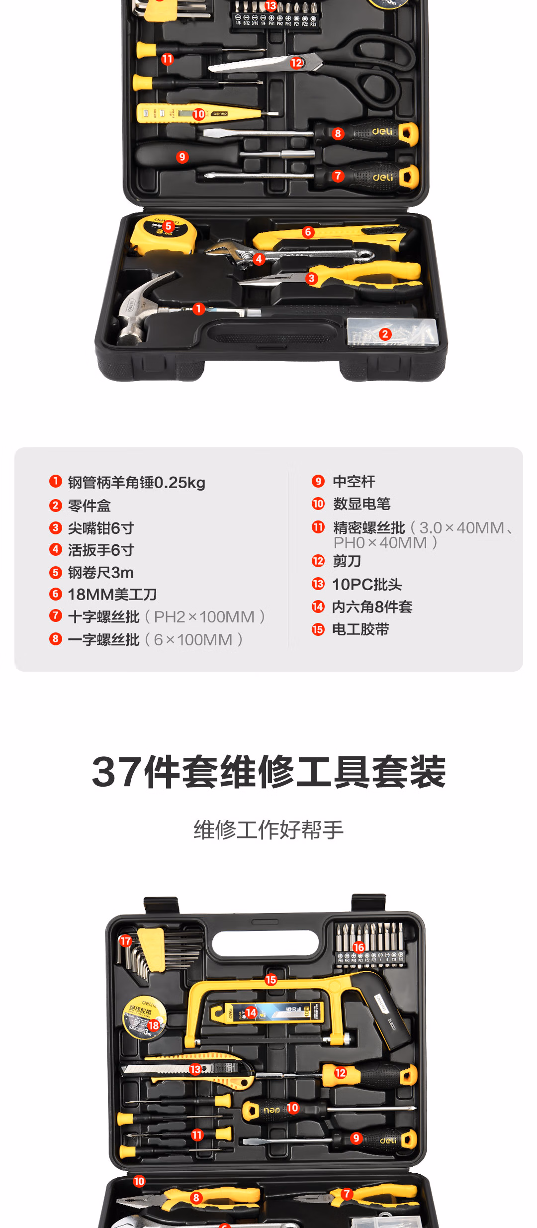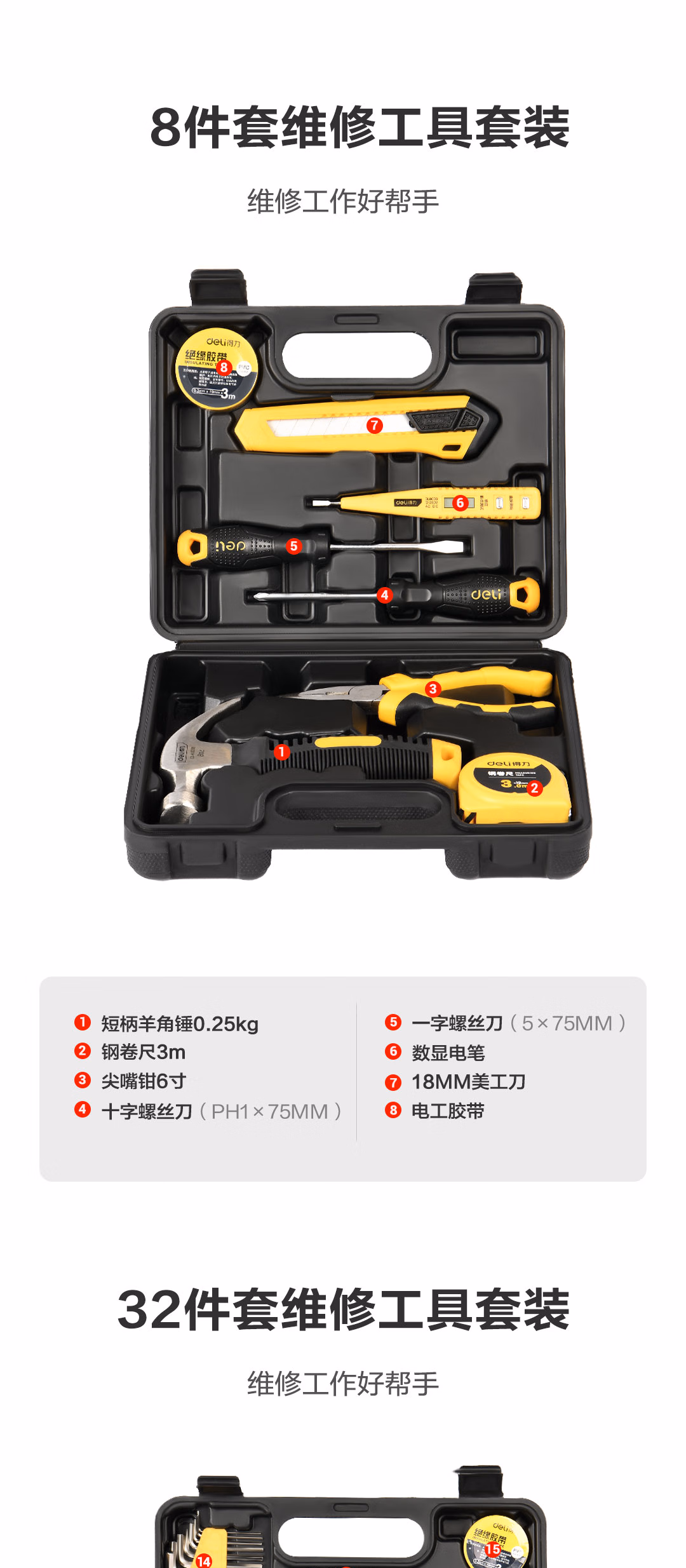包装清单  :   得力(deli)家用工具箱套装电工木工电讯维修组套五金手动工具套装32件套
