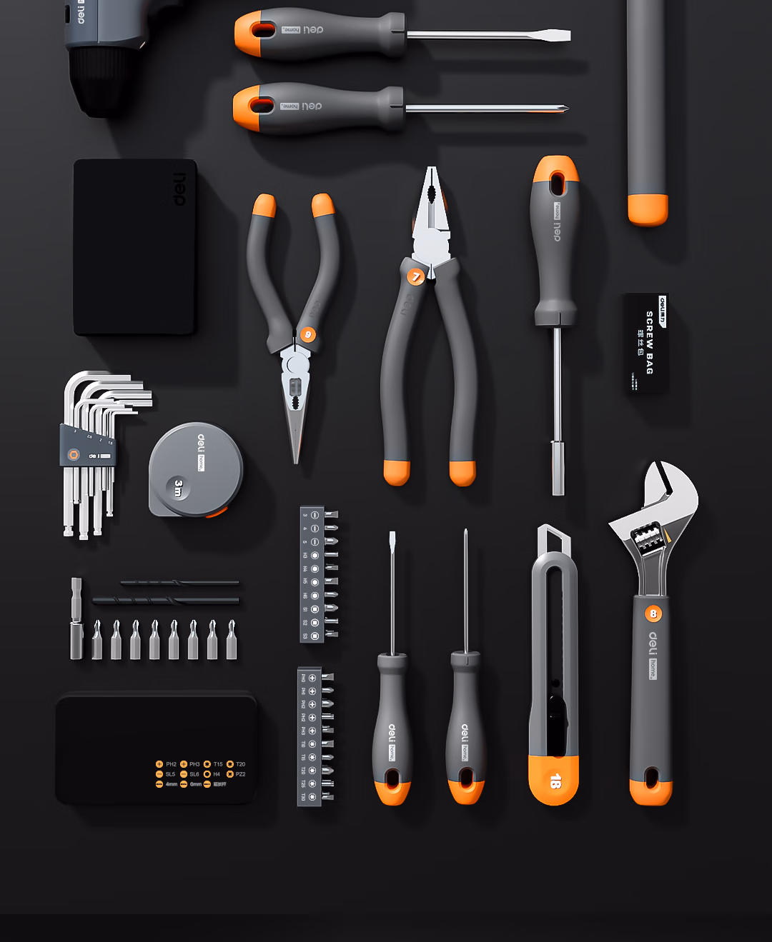 包装清单  :   得力(deli)家用工具箱电钻电动螺丝刀扳手老虎钳卷尺螺丝刀组合工具套装