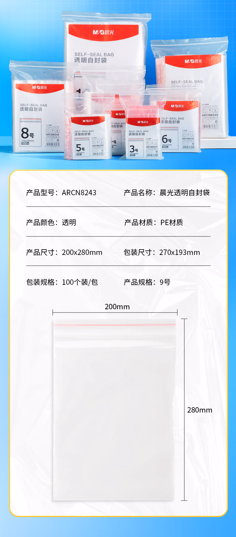 包装清单  :   晨光(M&G)9号自封袋透明塑封口袋 加厚大小号包装袋 日用收纳旅游出行保存袋200*280mm 100个装/包 ARCN8243