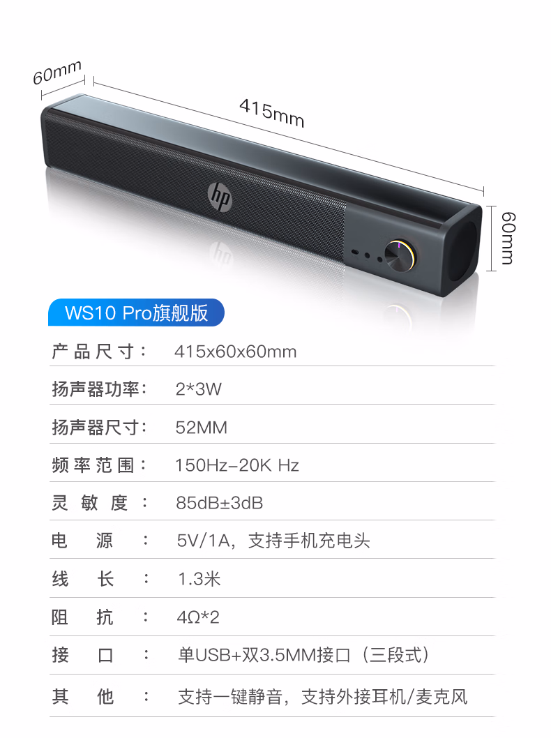 包装清单  :   惠普(HP)WS10Pro电脑音响长条桌面音箱家用低音炮立体环绕声