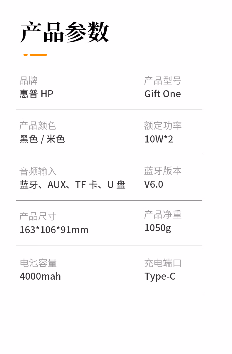 包装清单  :   惠普(HP)高保真复古蓝牙便携音箱 桌面音响 发烧级一体式大功率音响 居家礼物立体声环绕 超长续航Gift One