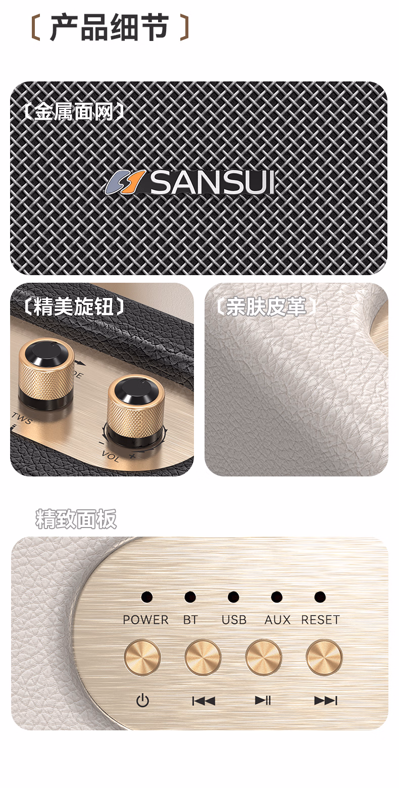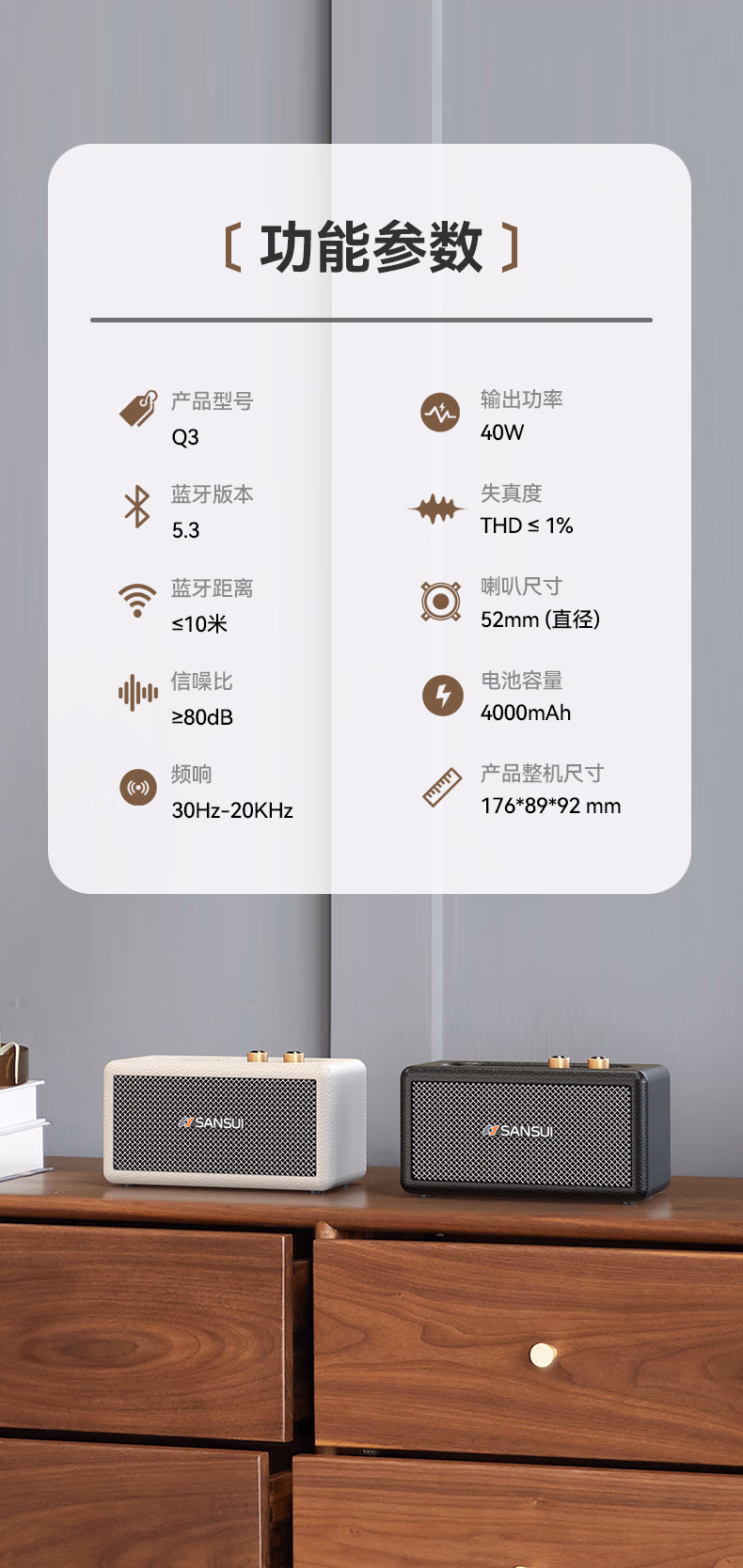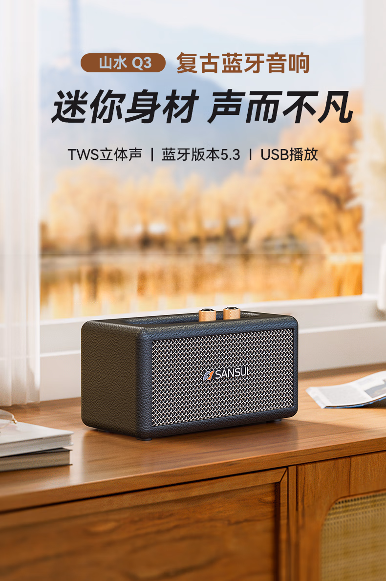 包装清单  :   山水(SANSUI)Q3家庭高音质无线蓝牙音箱重低音炮立体环绕家用便携式桌面迷你小音响大音量音乐播放器 白色