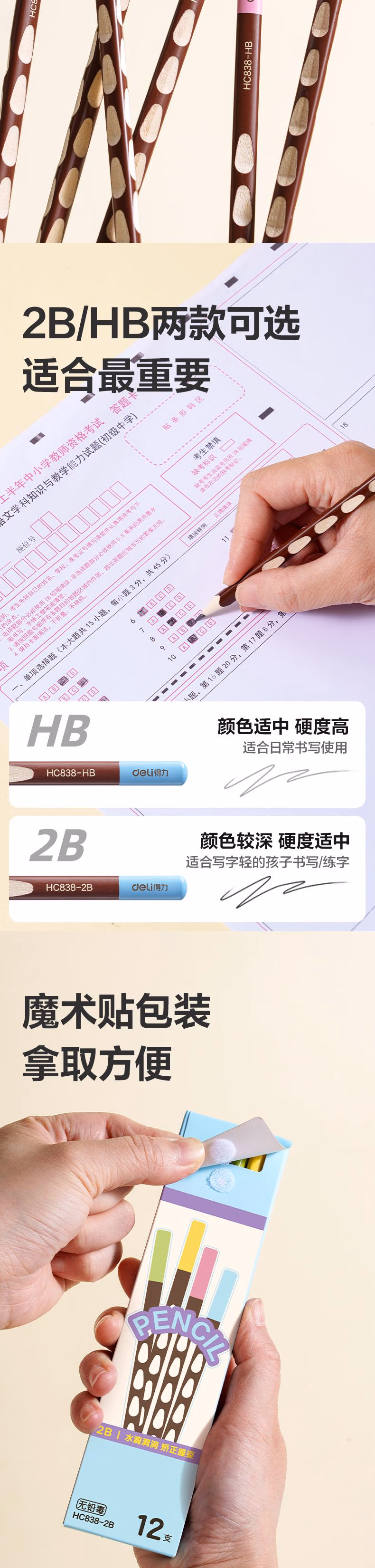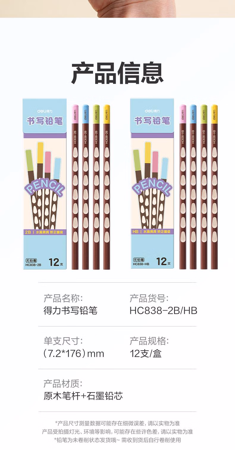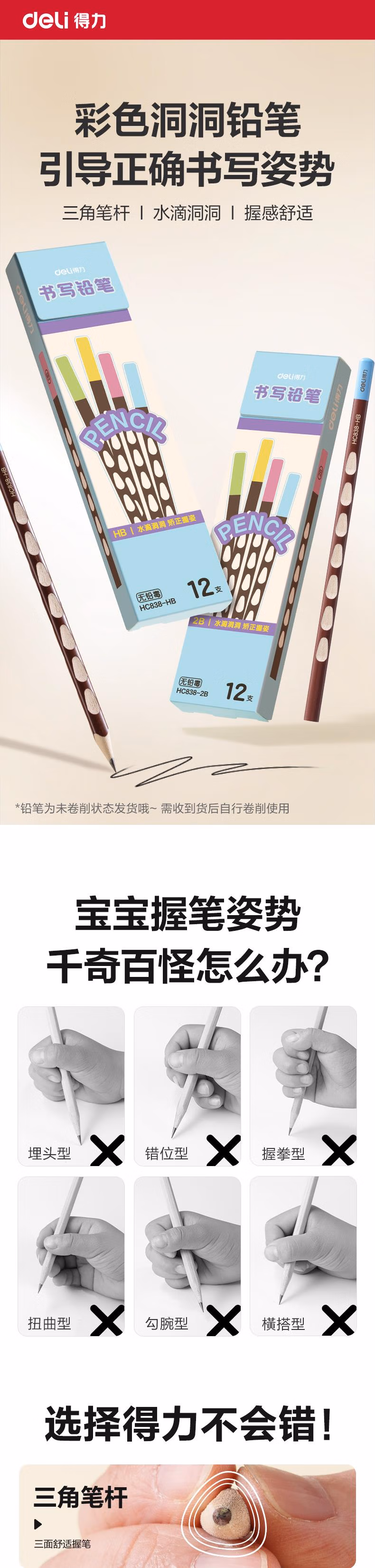 包装清单  :   得力(deli)12支洞洞笔书写铅笔2B铅笔三角杆易抓握儿童矫姿铅笔学生练字笔礼物HC838-2B学生开学礼物