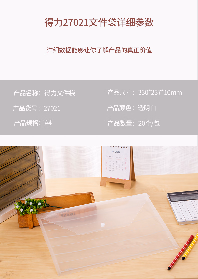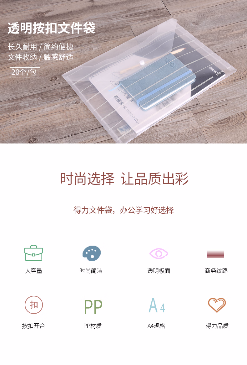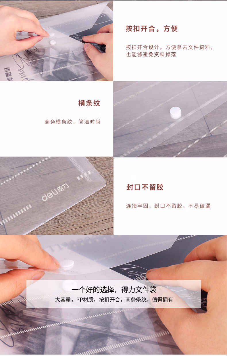 包装清单  :   得力(deli)20只A4条纹透明文件袋 按扣资料袋 试卷收纳袋 塑料档案袋 企业办公用品 学习用品 27021