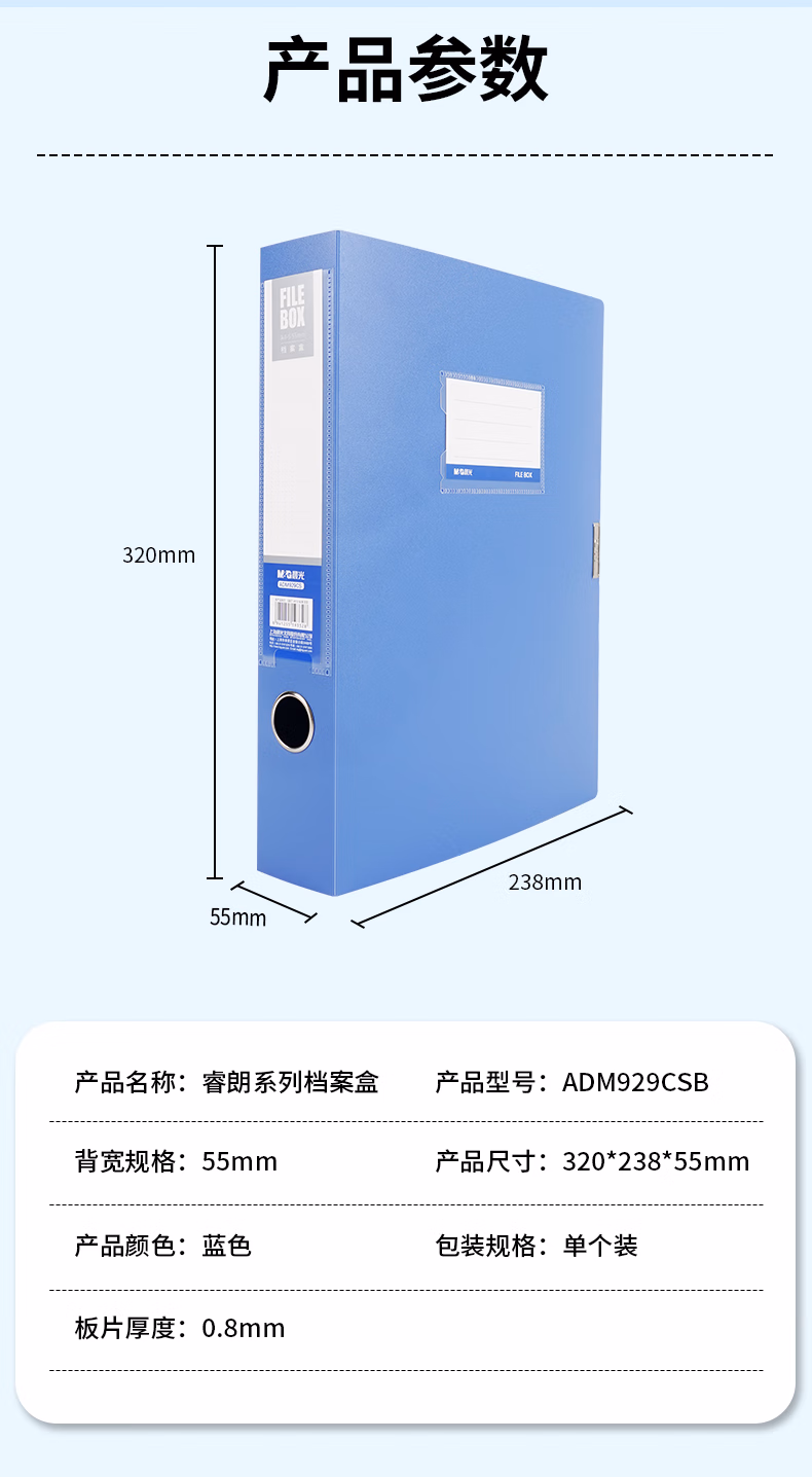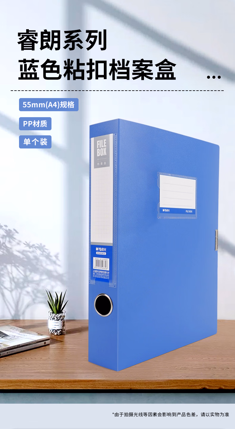 包装清单  :   晨光(M&G)文具 A4/55mm蓝色粘扣档案盒 PP文件盒 睿朗系列党建资料盒/财务凭证收纳盒 单个装ADM929CSB