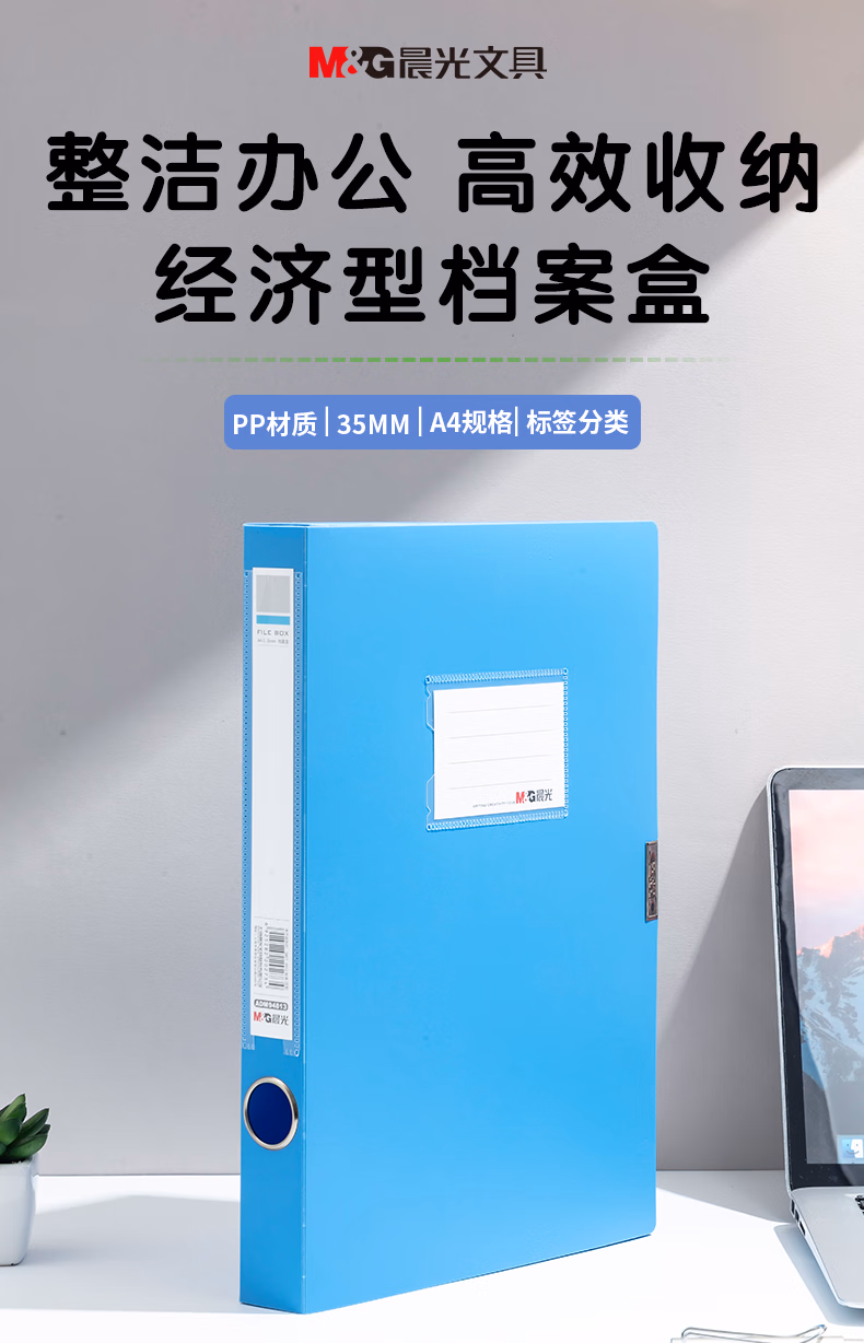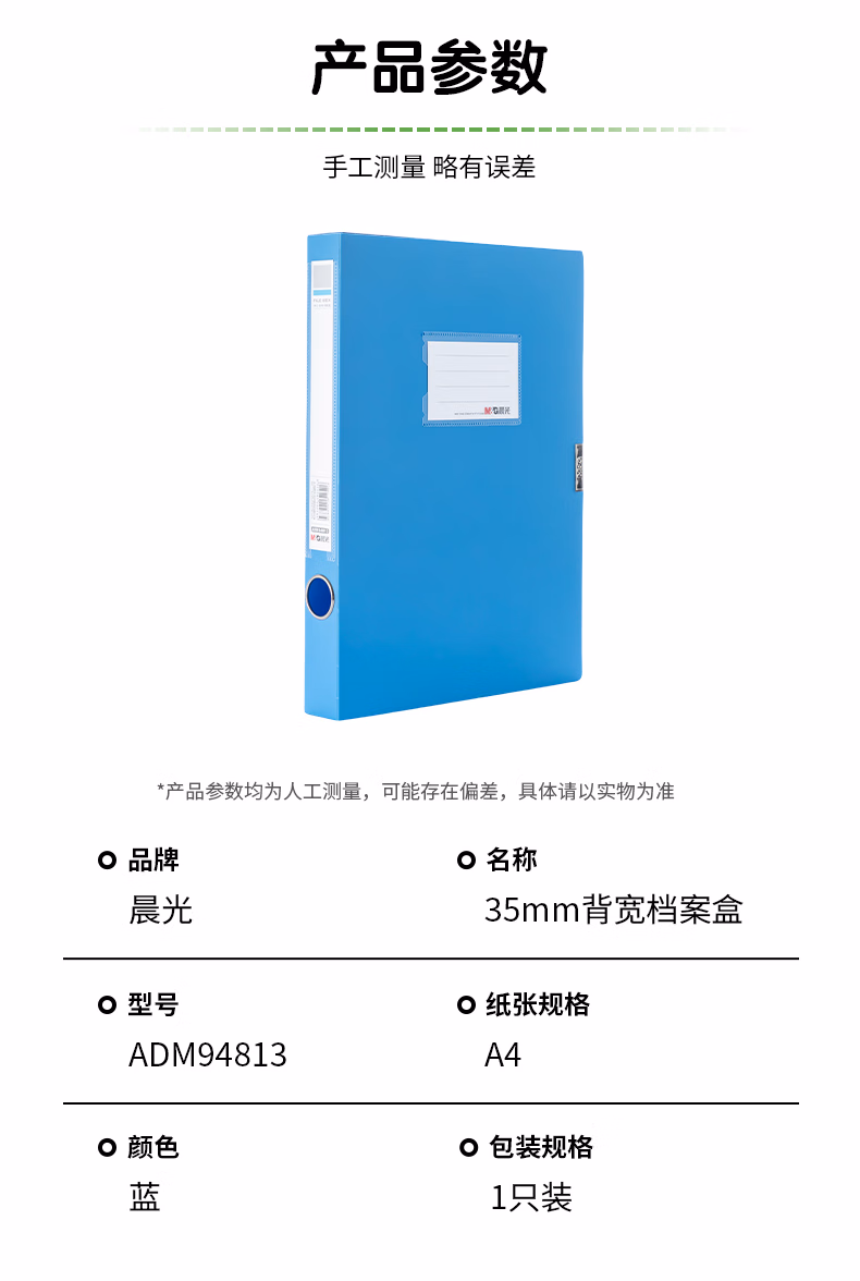 包装清单  :   晨光(M&G)文具 A4/35mm蓝色粘扣档案盒 加厚PP文件盒 党建资料盒/财务凭证收纳盒 单个装ADM94813B1