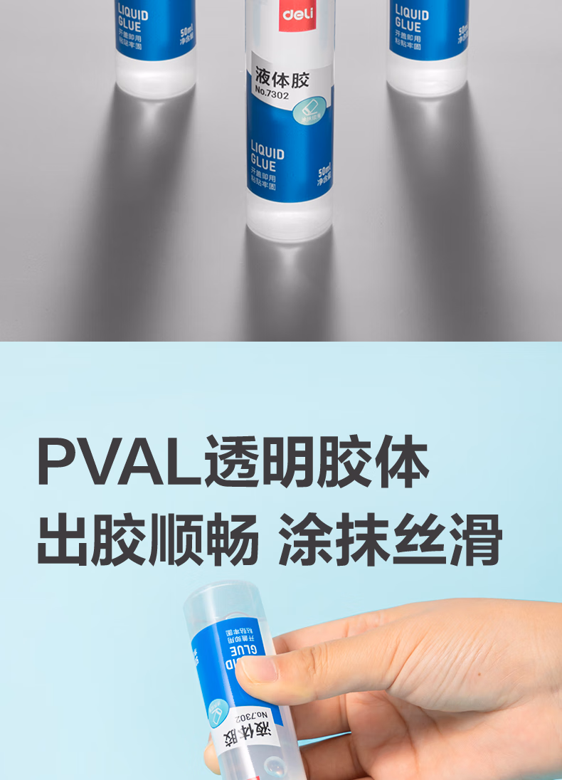 包装清单  :   得力(deli)50ml高透明胶水 可水洗高粘液体胶 手工DIY学生文具 开学必备学习用品 单支凑单 办公用品 7302