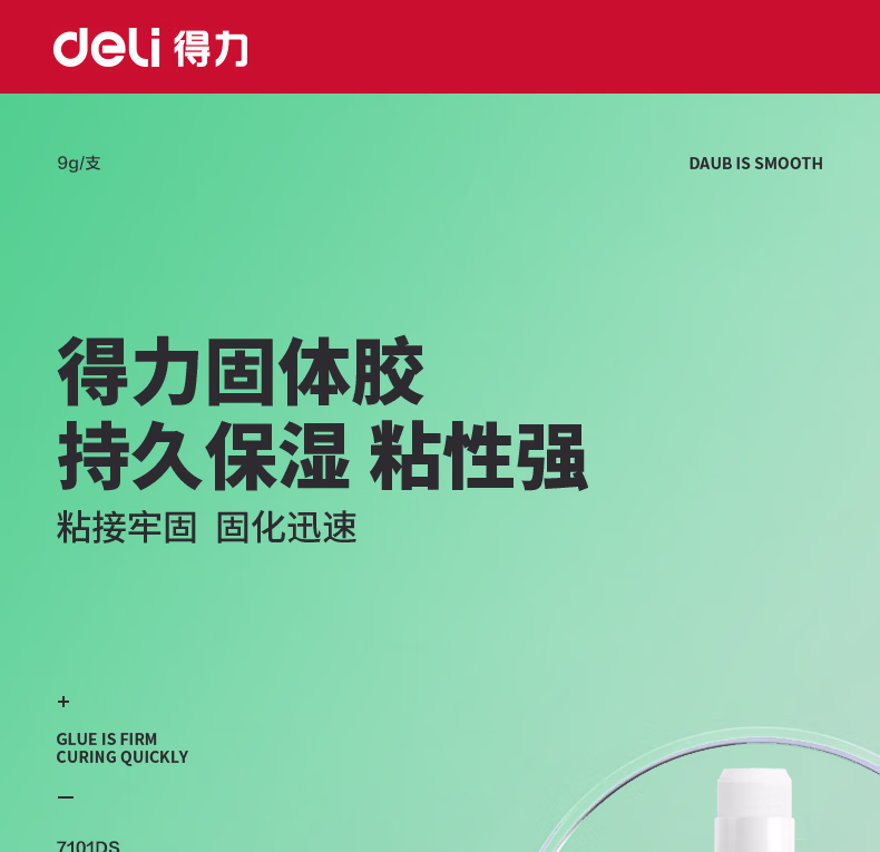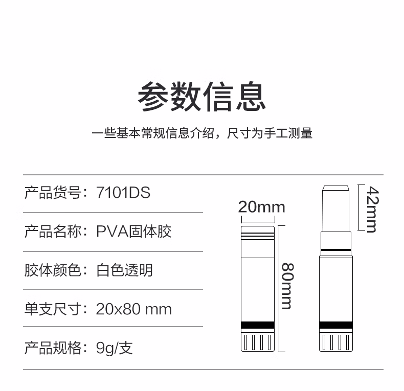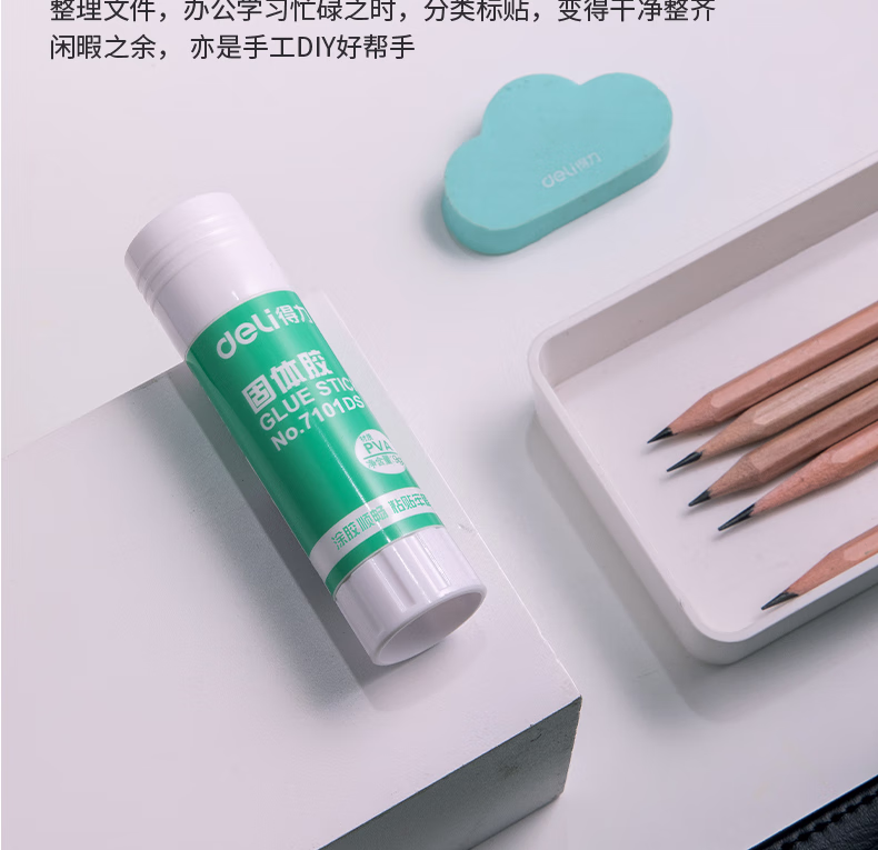 包装清单  :   得力(deli)9g高粘PVA固体胶水 速干可水洗胶棒 DIY手工粘胶学生文具 办公用品 单支凑单 7101DS